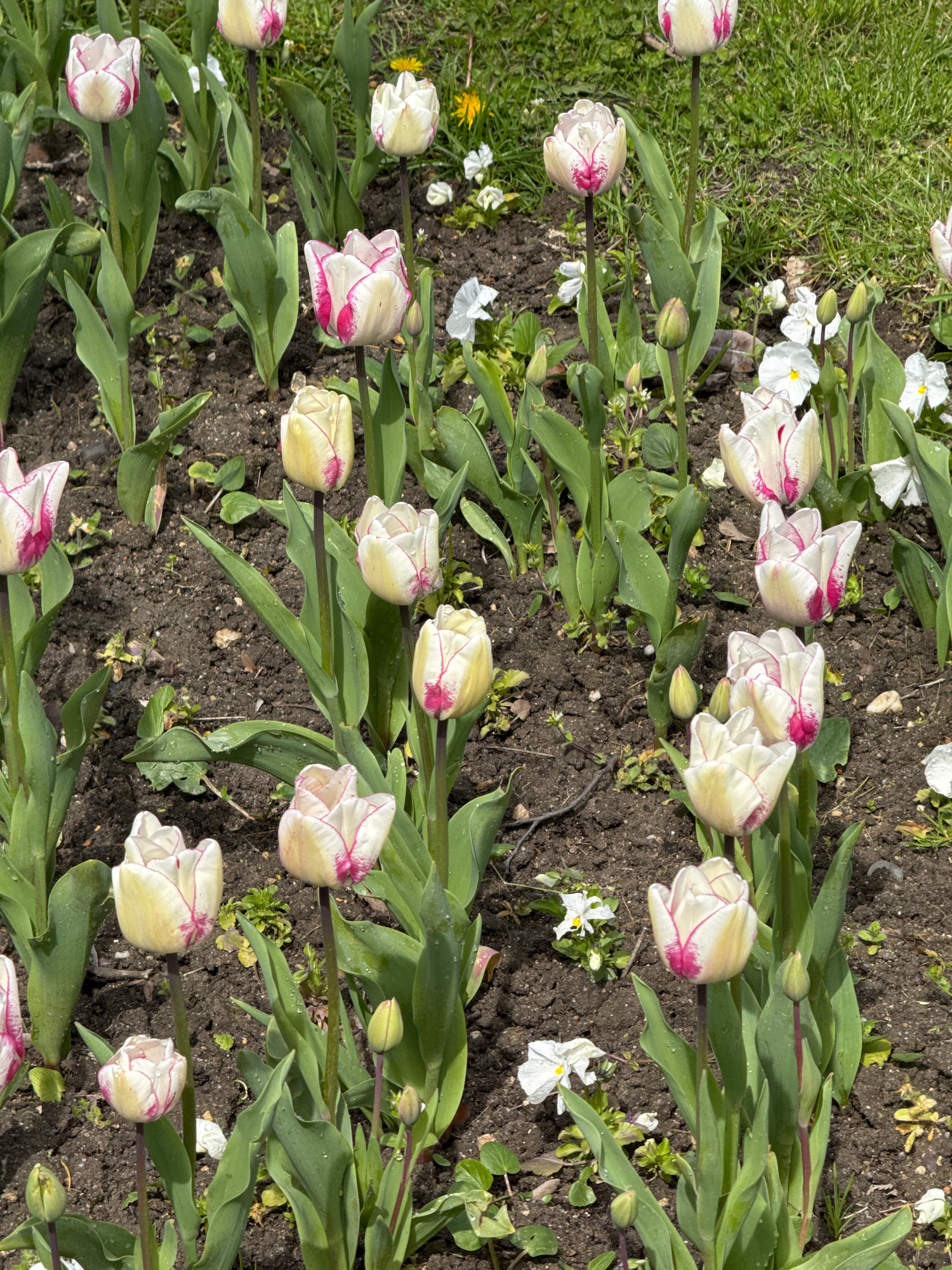 The image shows a flowerbed in Varna, Bulgaria. The flowerbed contains tulips with white petals and pink edges. Some of the tulips are fully open, while others are still closed buds. The soil is dark…read more