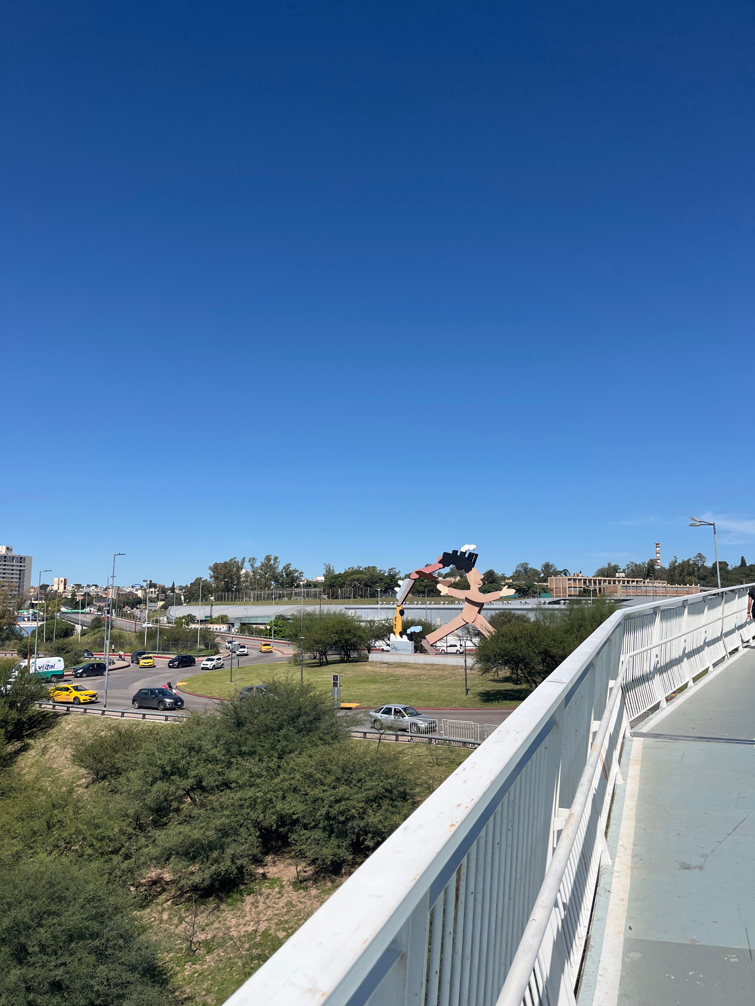 The image shows a view from a bridge in Cordoba, Argentina. The bridge has white railings on the right side of the image. On the right side of the road below is a large, colorful sculpture of three hu…read more