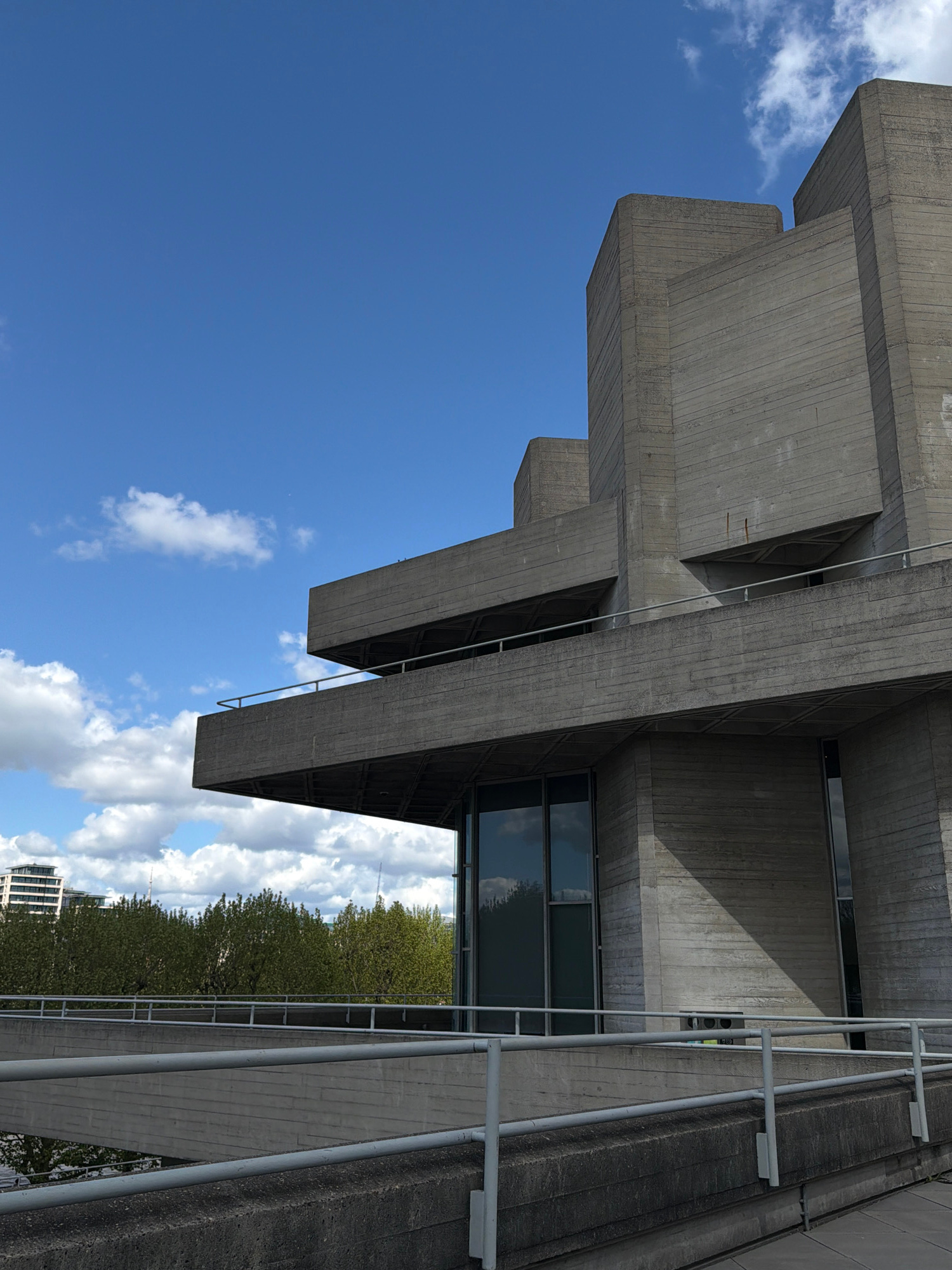 The image is a low-angle shot of a Brutalist concrete building against a blue sky with scattered white clouds. The building features cantilevered sections that create a layered effect, with visible ho…read more