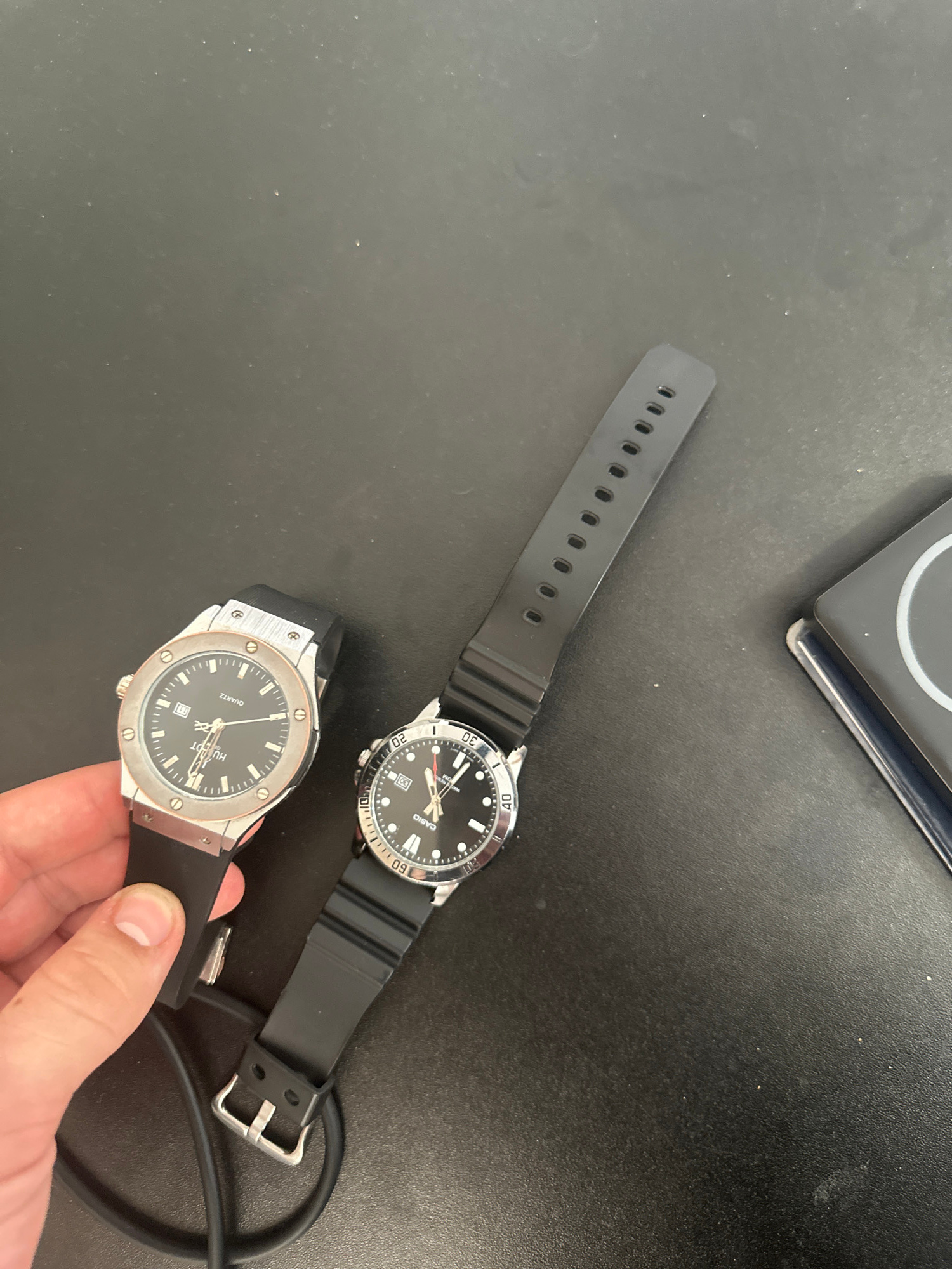 The image shows two wristwatches on a black surface. The wristwatch closest to the viewer is silver with a black face and a black rubber strap, held by a hand. It appears to be a Hublot. Adjacent to i…read more