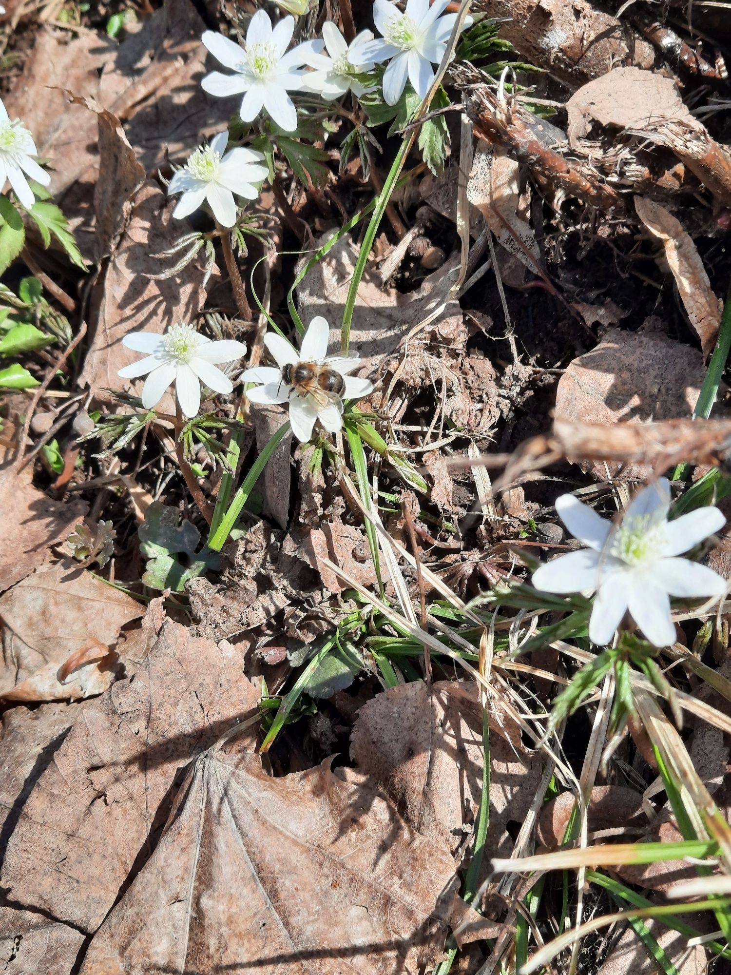 The scene depicts a patch of ground covered in dry leaves and grass in Krasnogorskoye, Russia. Several small white flowers with 6-7 petals are scattered among the foliage. A bee is visible on one of t…read more
