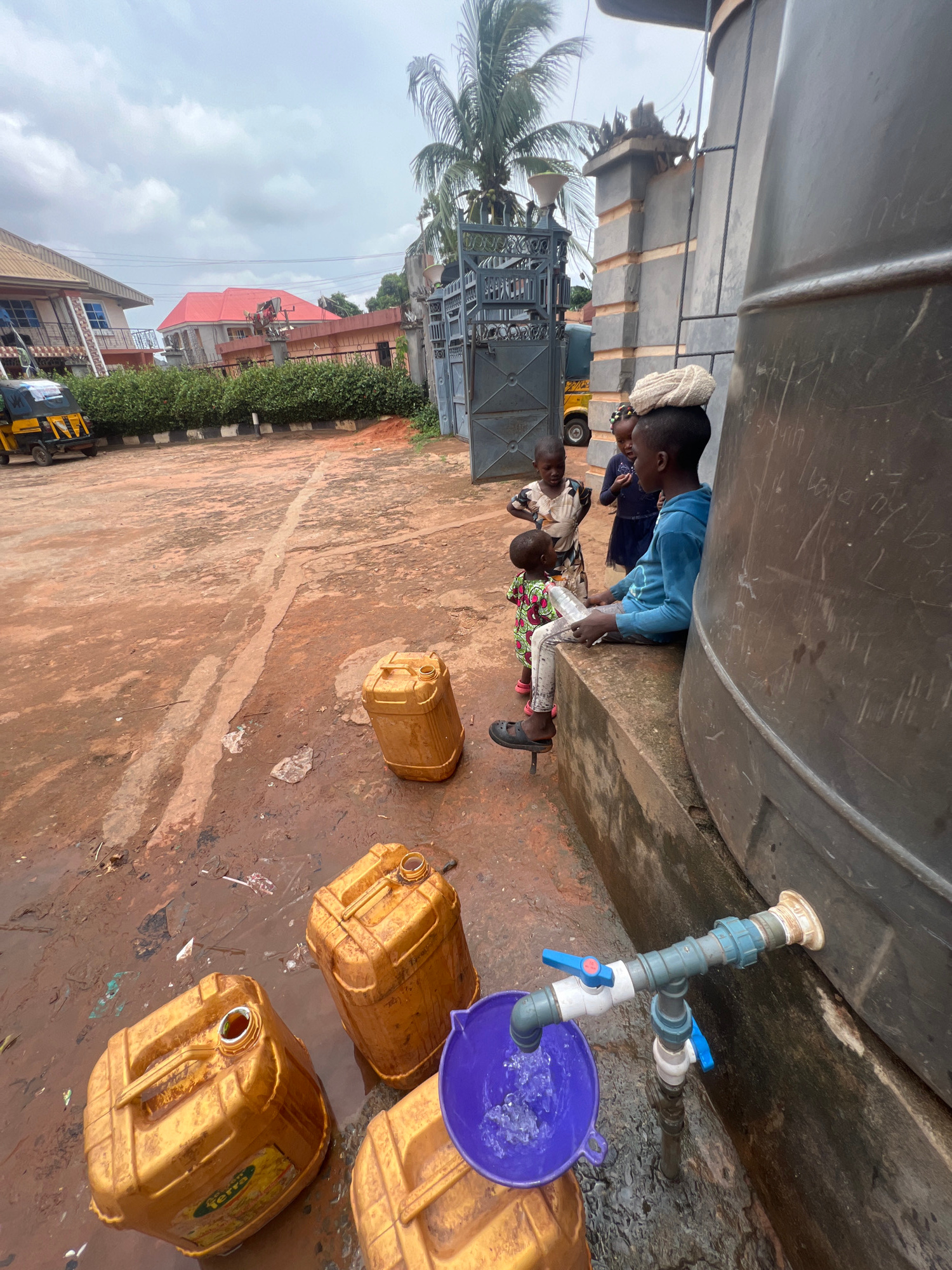 In Obosi, Nigeria, several children are gathered around a large, elevated water tank. They appear to be collecting water from a tap. The ground is muddy. There are several yellow jerrycans nearby, pre…read more