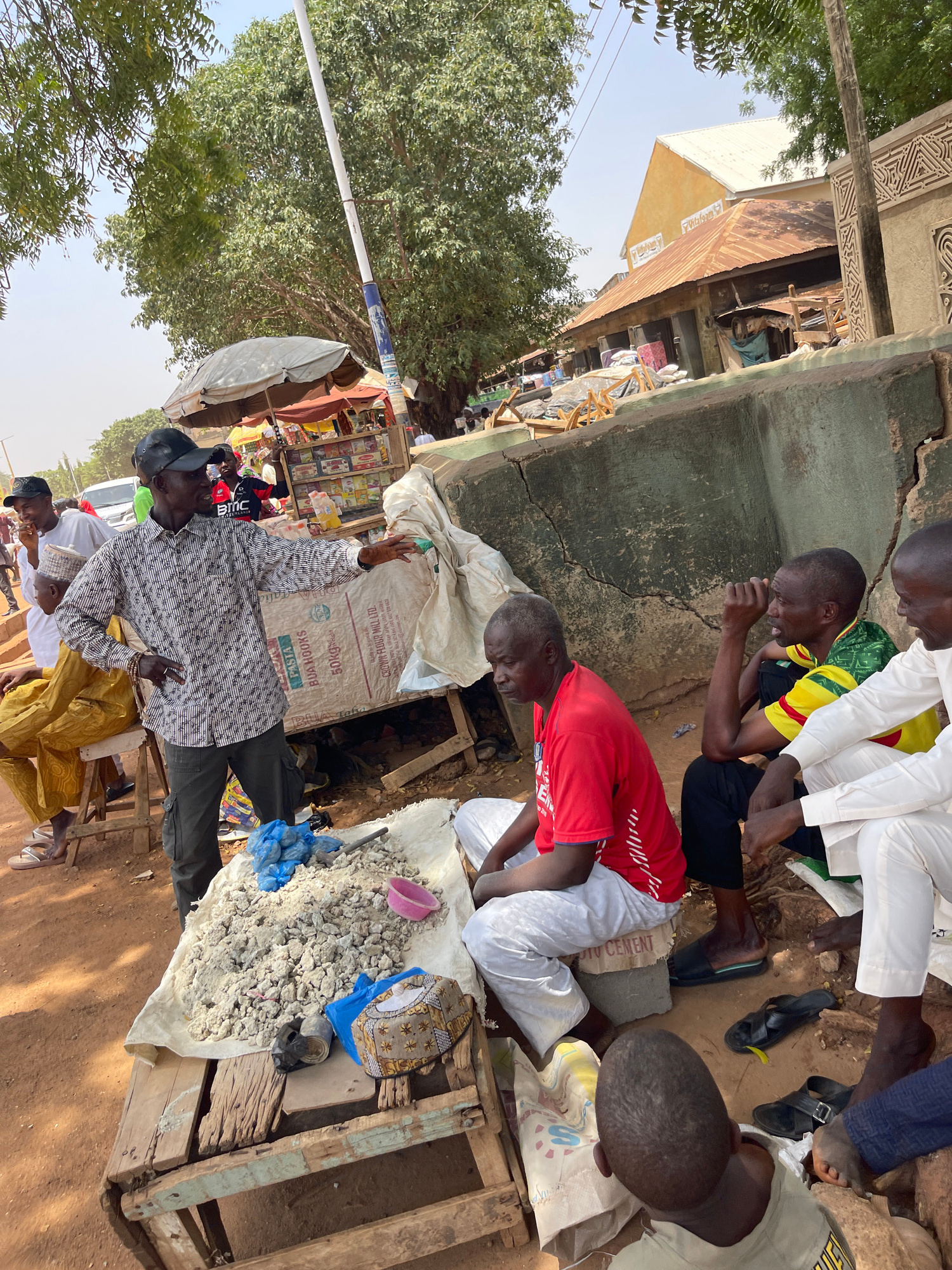 This outdoor market scene captures a group of men engaged in commerce and daily activities, likely in Zaria, Nigeria. The image is taken from a slightly elevated perspective, looking down into a bustl…read more