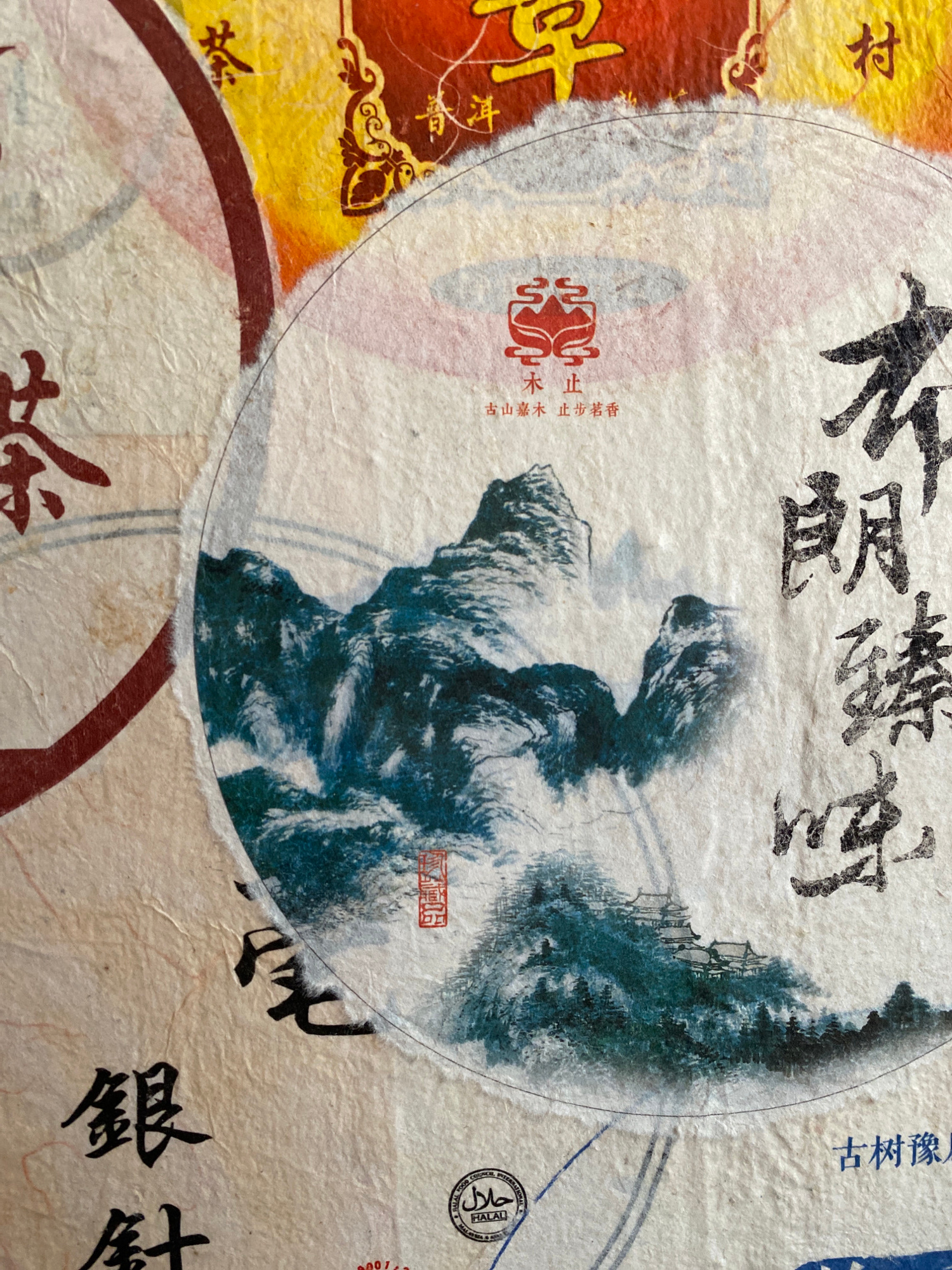 The image shows a close-up of a textured surface, possibly paper, with several overlaid elements. The dominant element is a circle containing an image of a mountain landscape rendered in blue and whitβ¦read more