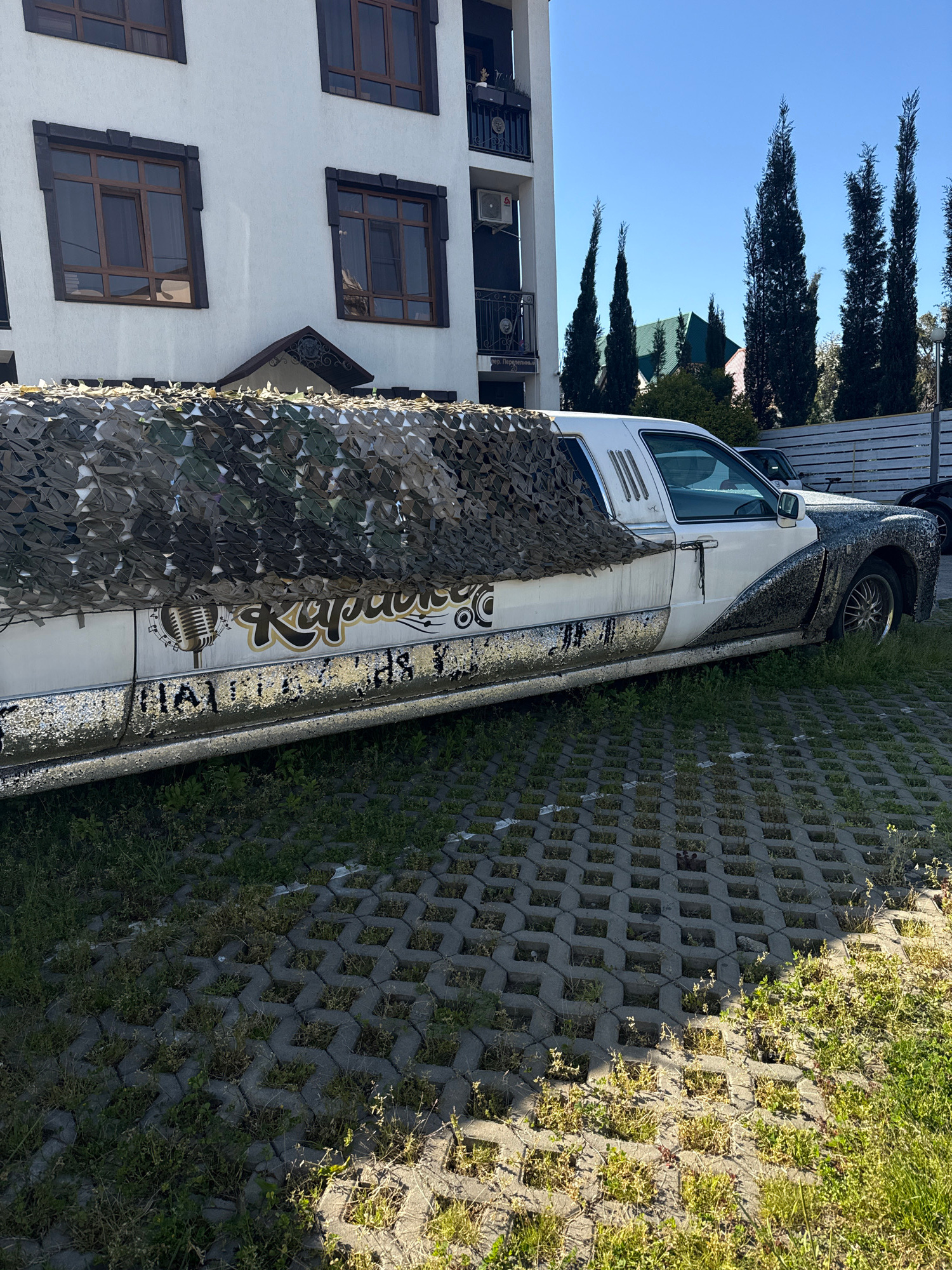 The image displays an outdoor scene in Sochi, Russia, featuring a customized vehicle parked on patterned pavers next to a white multi-story building, beneath a clear blue sky. Bright sunlight illumina…read more