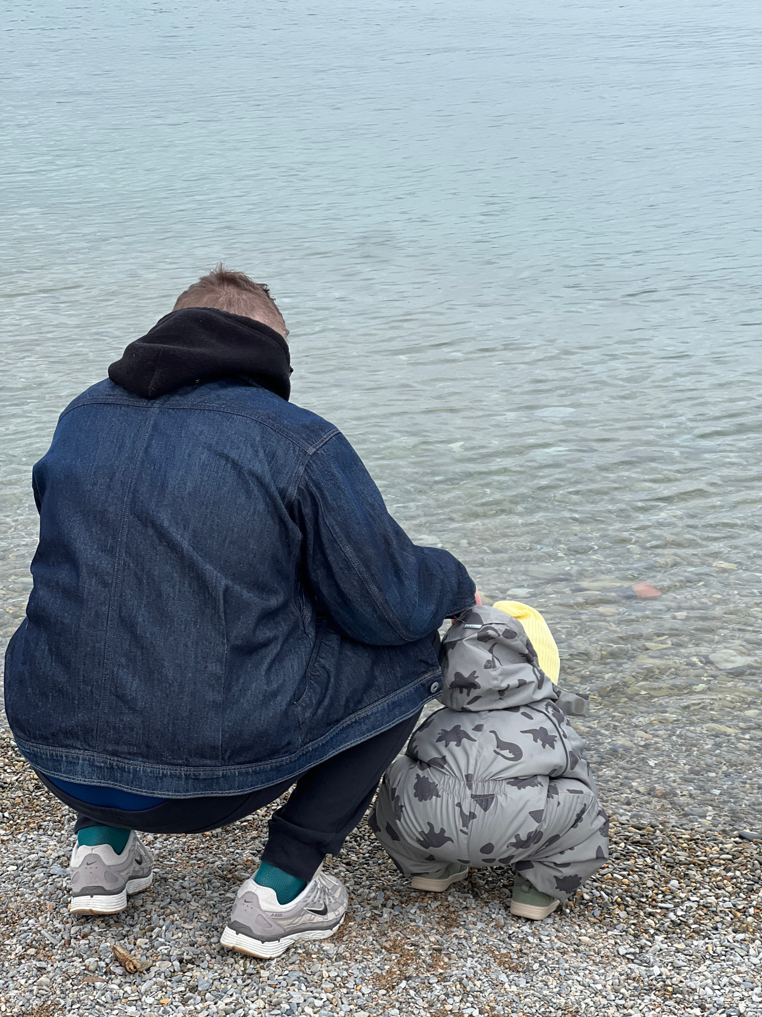 A photo taken at a low angle shows two people at the shore of a body of water. One person is wearing a dark denim jacket, a black hooded sweatshirt, black sweatpants, grey sneakers, and teal-green soc…read more
