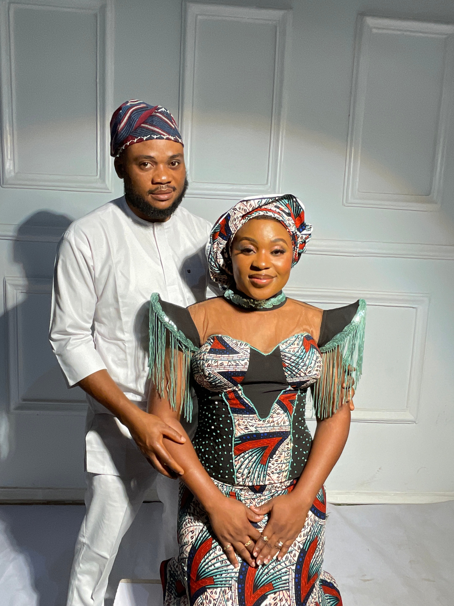 Two people, a man and a woman, pose for a portrait. The woman wears a patterned dress with fringe detailing and a matching headwrap. Her hands, adorned with rings, rest on her stomach. The man is in a…read more