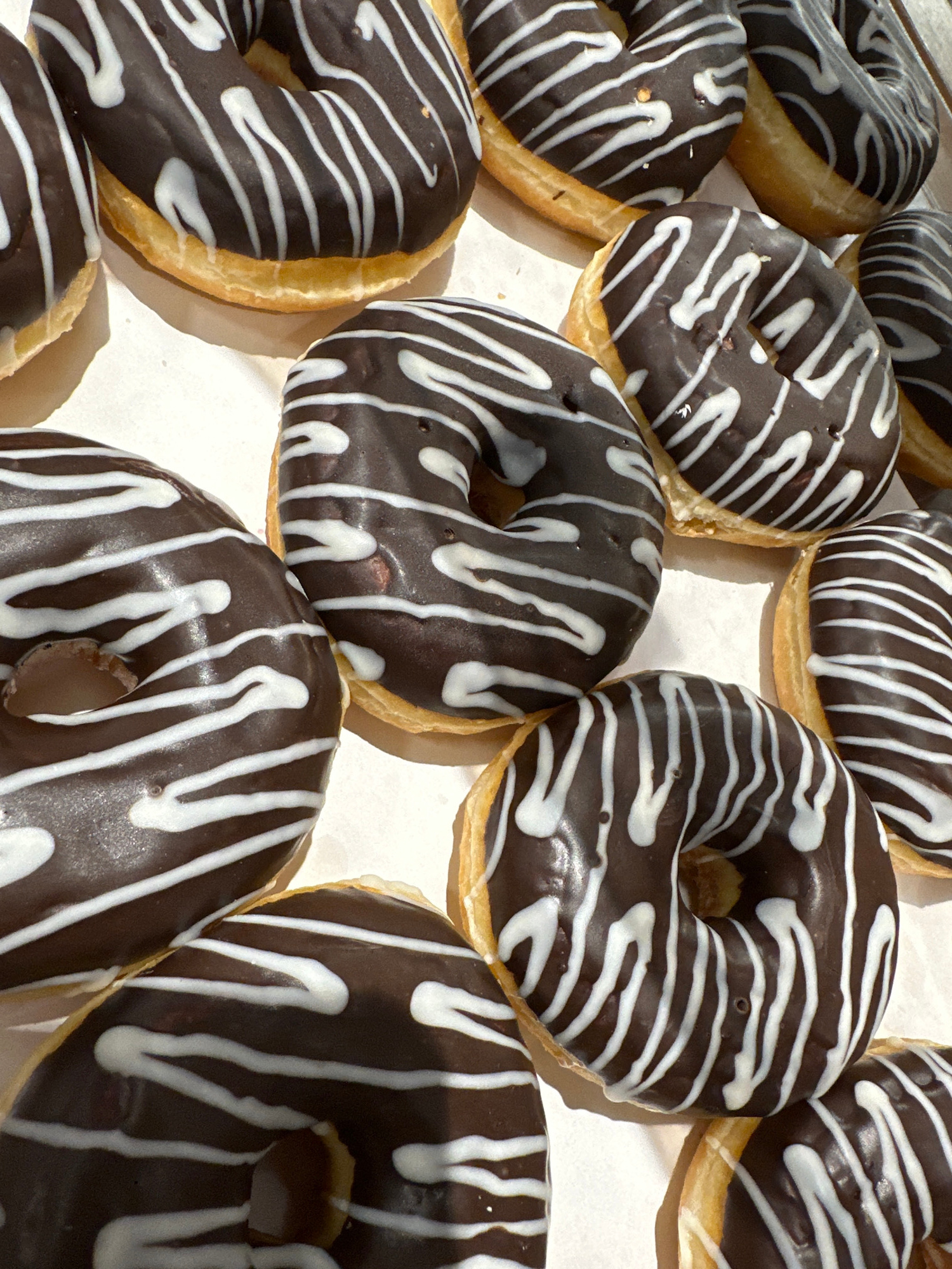 The image presents a close-up, high-angle view of numerous ring-shaped donuts, predominantly coated in dark chocolate icing and adorned with white drizzle. At least ten donuts are visible, some partiaβ¦read more