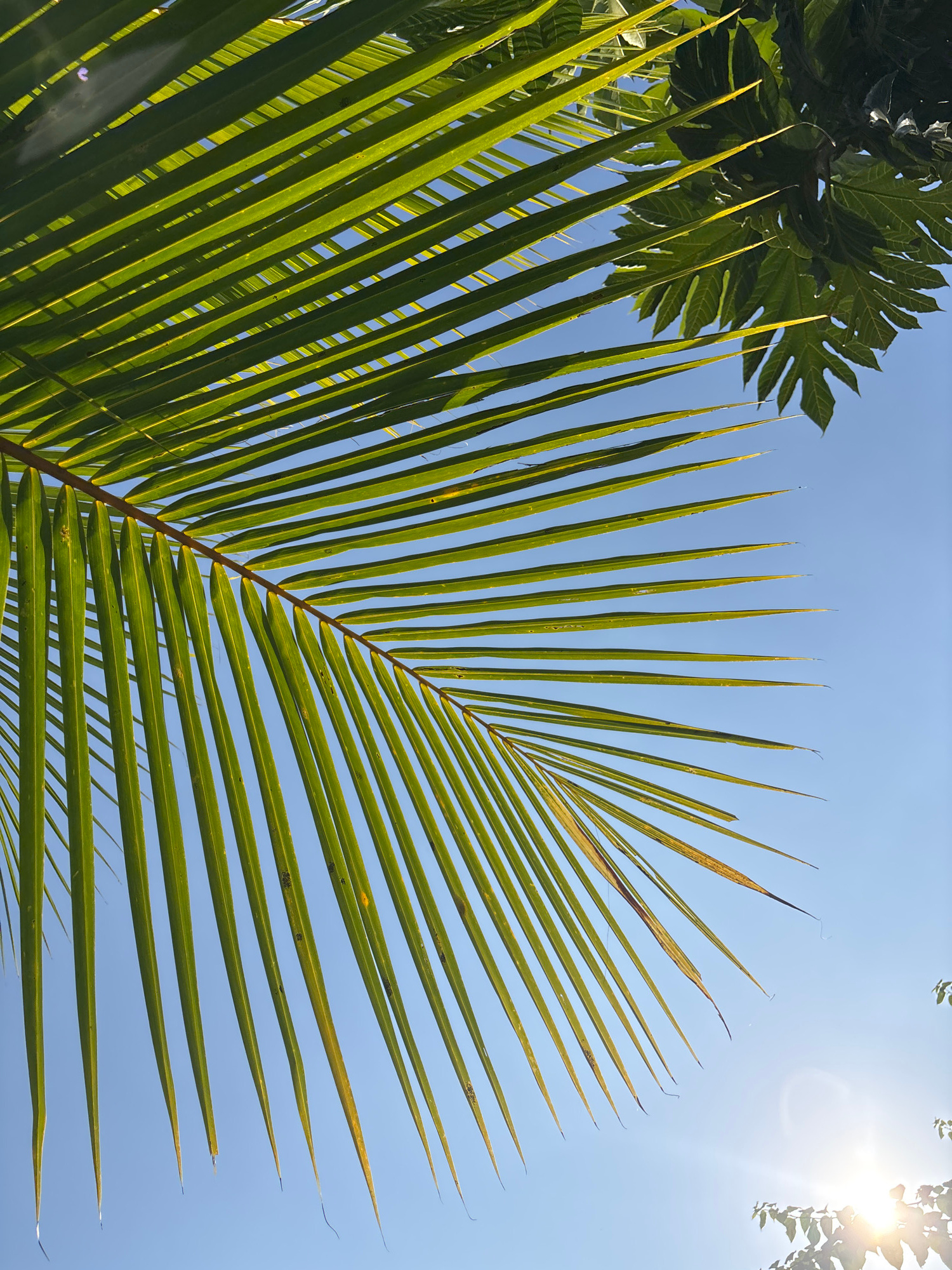 A palm frond, likely from a coconut palm, dominates the view against a clear, light blue sky. The frond extends diagonally from the lower left to the upper right. Its leaflets are a bright, vibrant gr…read more