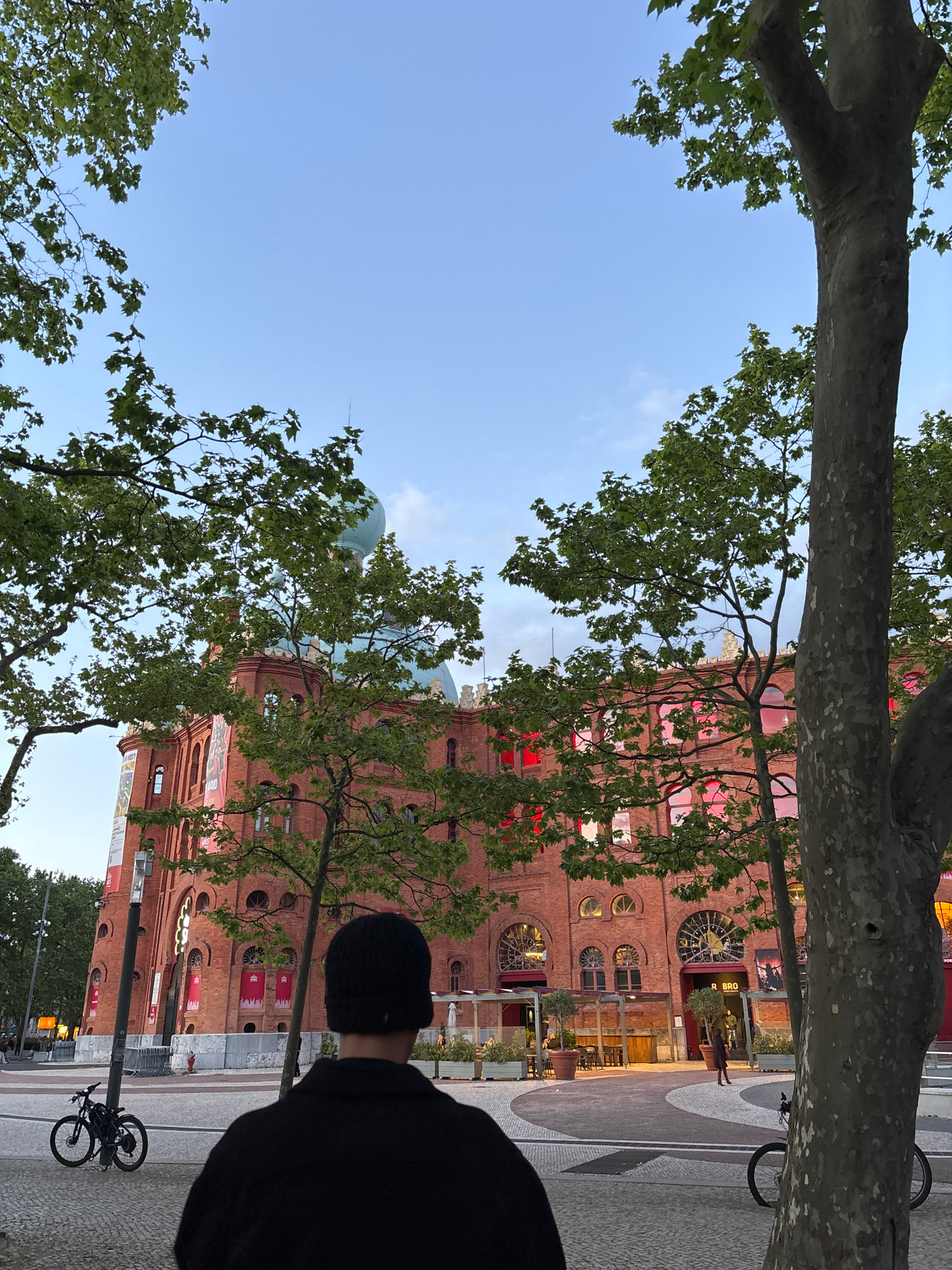 A low-angle shot looking up at the Campo Pequeno bullring in Lisbon, Portugal. A person wearing a black knit cap and black jacket stands on the sidewalk. A light pole with a bicycle locked to it are n…read more
