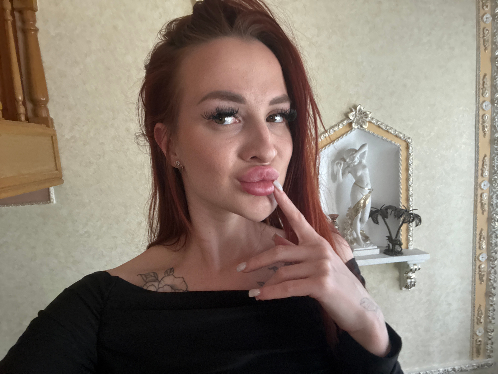 A woman with auburn hair, fair skin, and tattooed hands and chest, is posing indoors. She is wearing a black top. The background includes a decorative wall hanging with a golden frame, and a wooden ta…read more