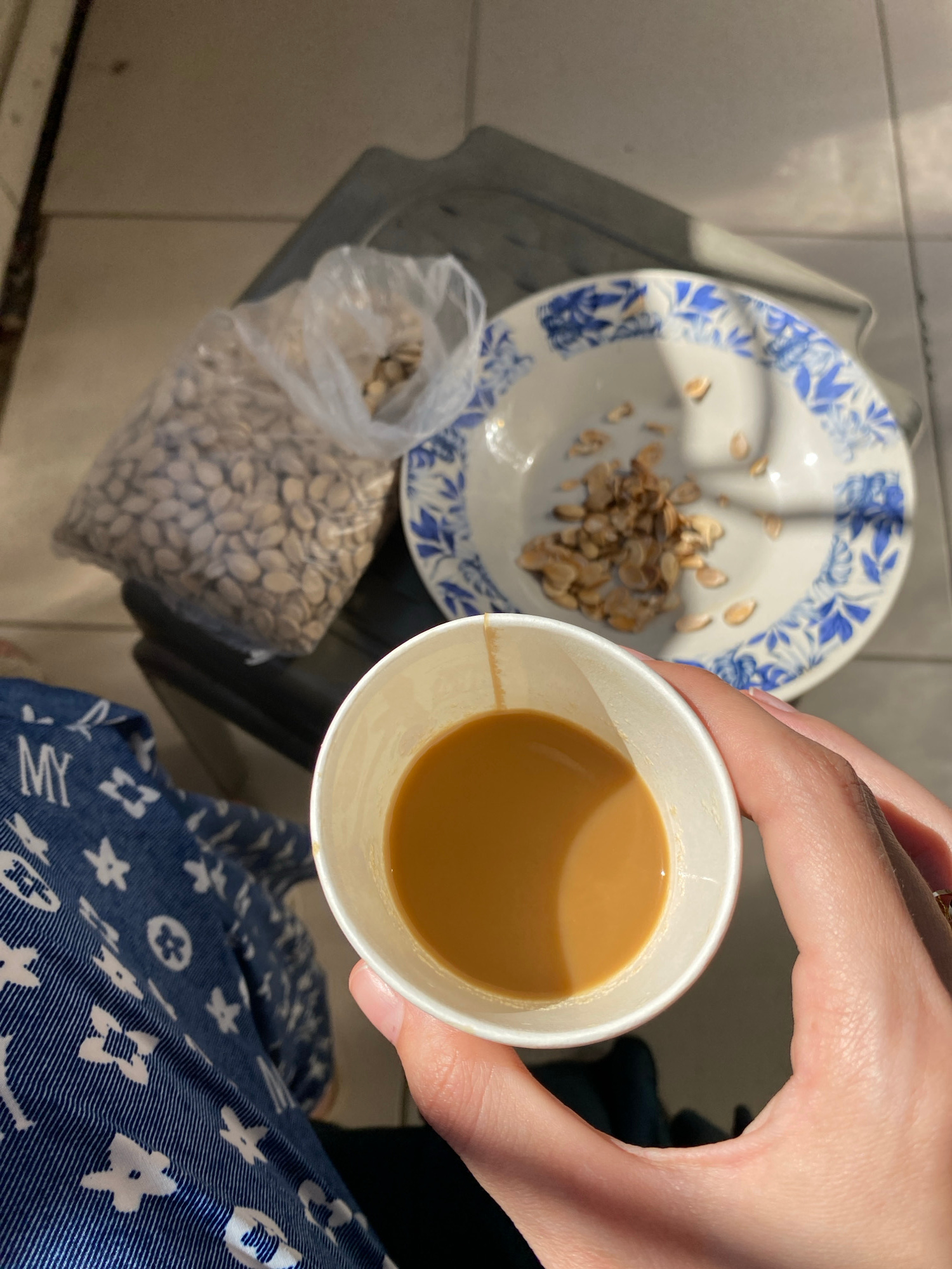 A high-angle, close-up shot captures a person's hand holding a white paper cup filled with a light brown beverage, likely tea or coffee. The hand has a ring on one finger. Next to the cup, a white cer…read more