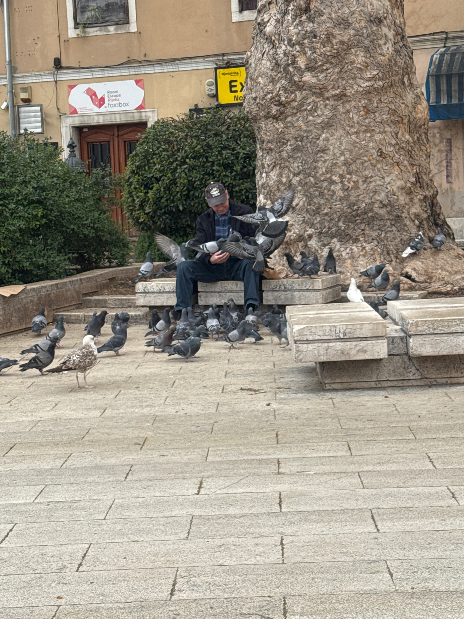 A man is standing on a paved area surrounded by pigeons and one seagull. The location is most likely in the city of Grad Rijeka, Croatia, due to the presence of a sign for "Room Escape Rijeka by FoxBo…read more