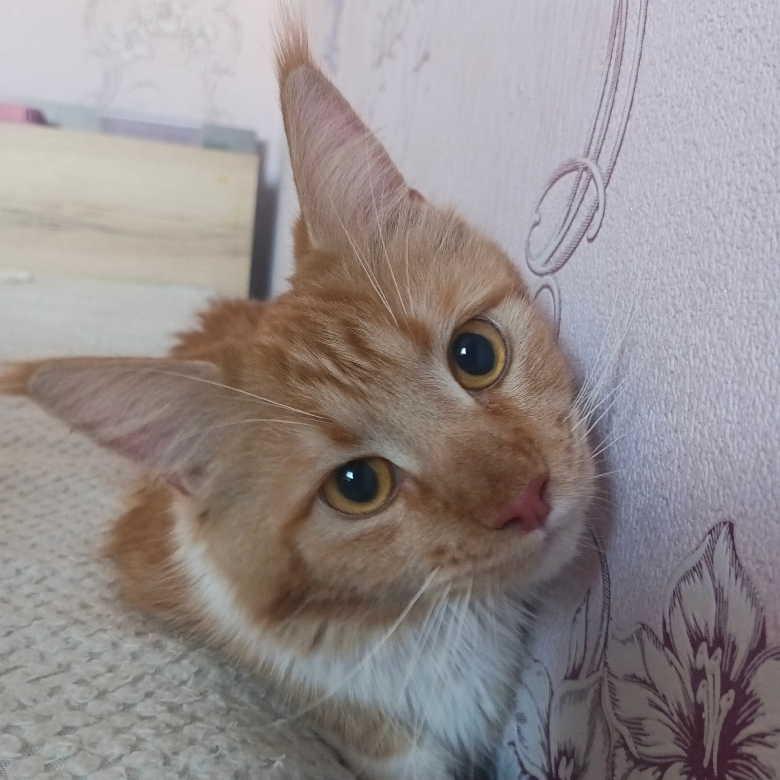 A close-up, eye-level shot features an orange tabby cat indoors, looking directly at the viewer with a curious and alert expression. The cat's face is slightly tilted, showcasing its large, round gold…read more