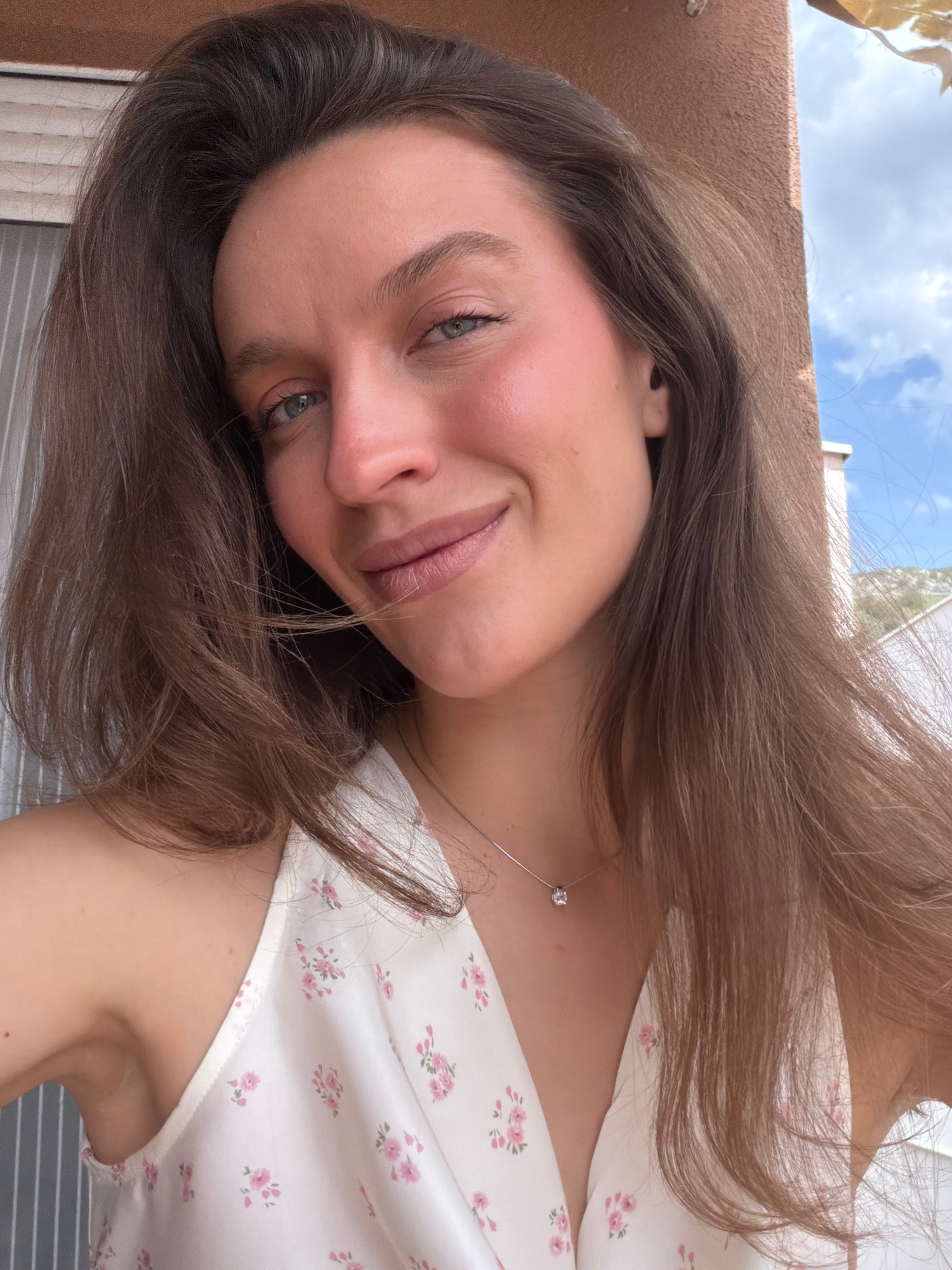 A young woman with long, slightly wavy brown hair is depicted in a close-up, upward-angled shot, likely a selfie, taken outdoors in Budva, Montenegro. Her head is tilted to the right as she gazes dire…read more