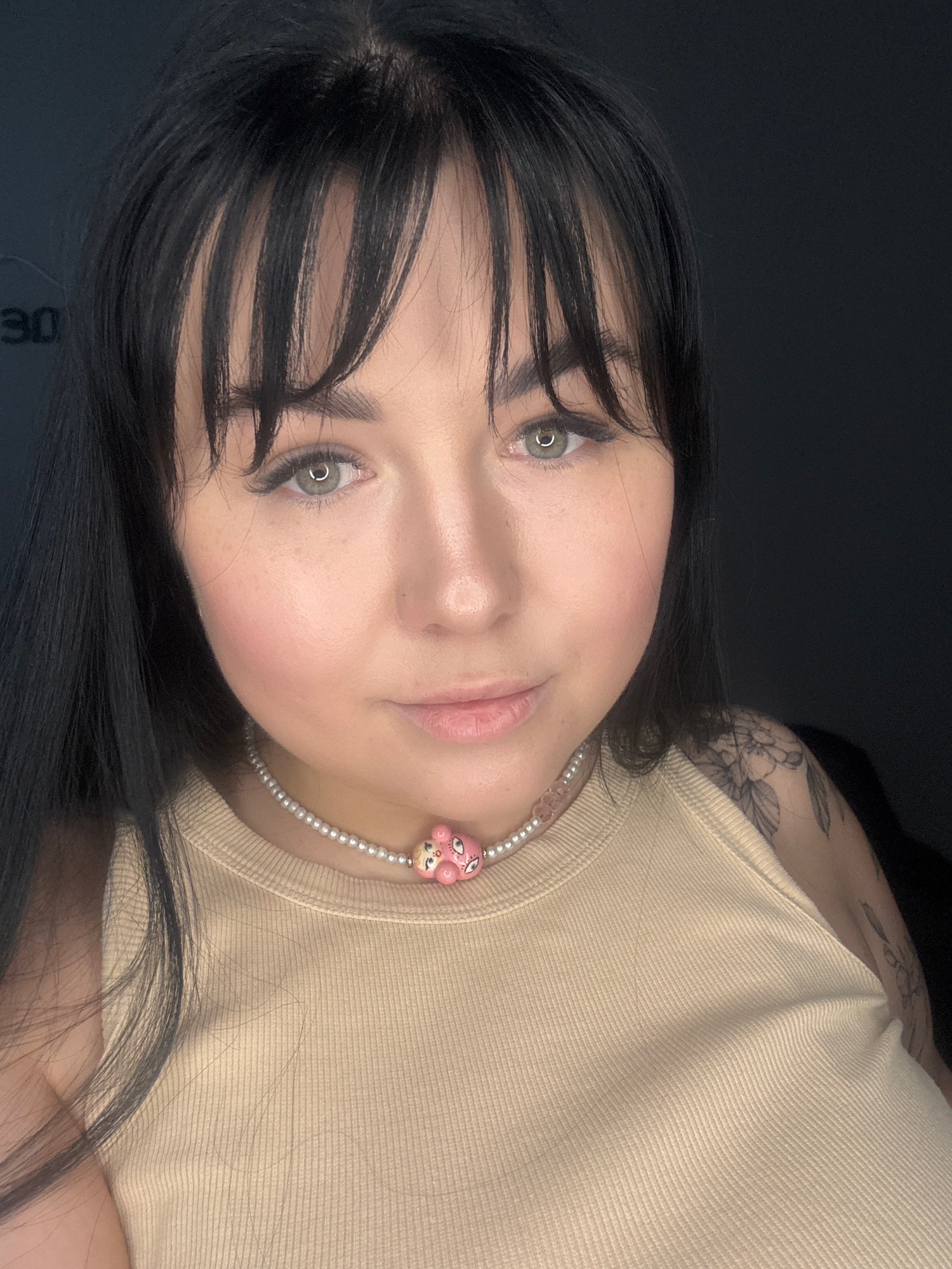 A close-up studio shot shows a woman with light skin, gray eyes, and black hair. She has short, choppy bangs and wears a beige ribbed top. A pearl necklace with a pink bear pendant adorns her neck. A…read more