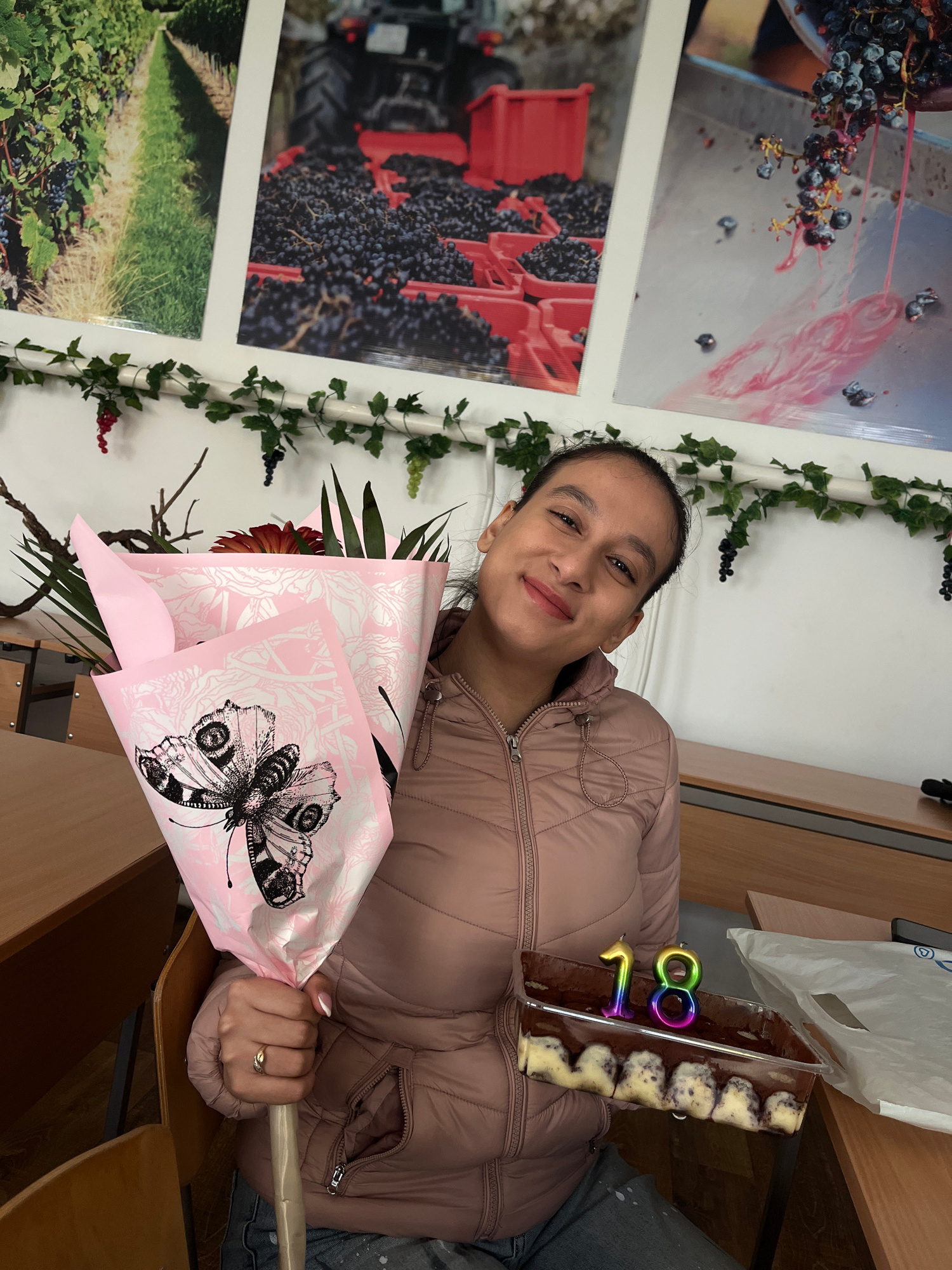 A young woman is posing indoors for a photograph. She is holding a pink bouquet with a butterfly print in one hand and a rectangular container of cake with the number 18 in candle form on top. She is…read more
