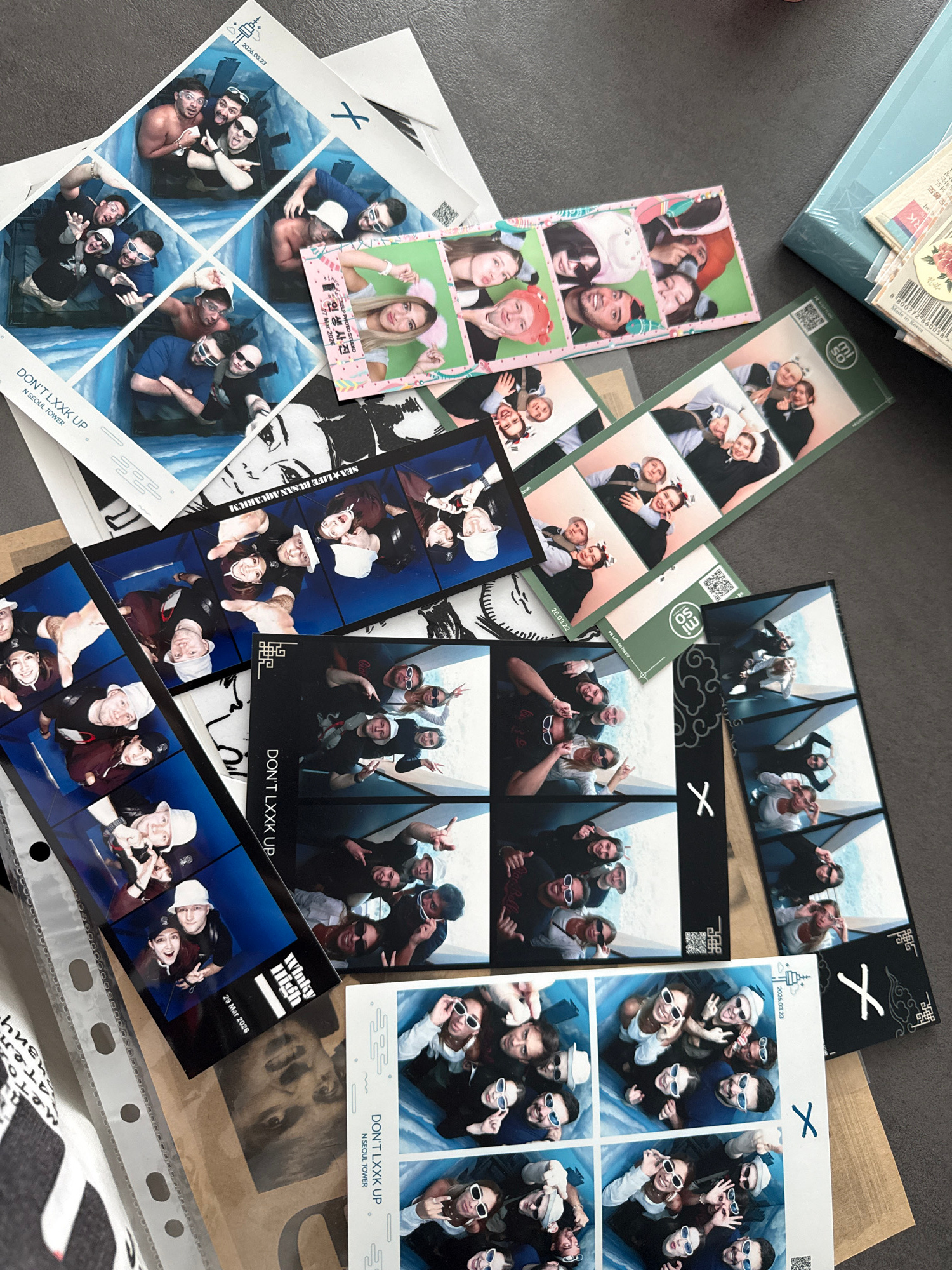 The image shows a collection of photo booth strips scattered on a gray surface, seemingly a tabletop. The strips vary in color, from black and white to full-color, and depict groups of people in playf…read more