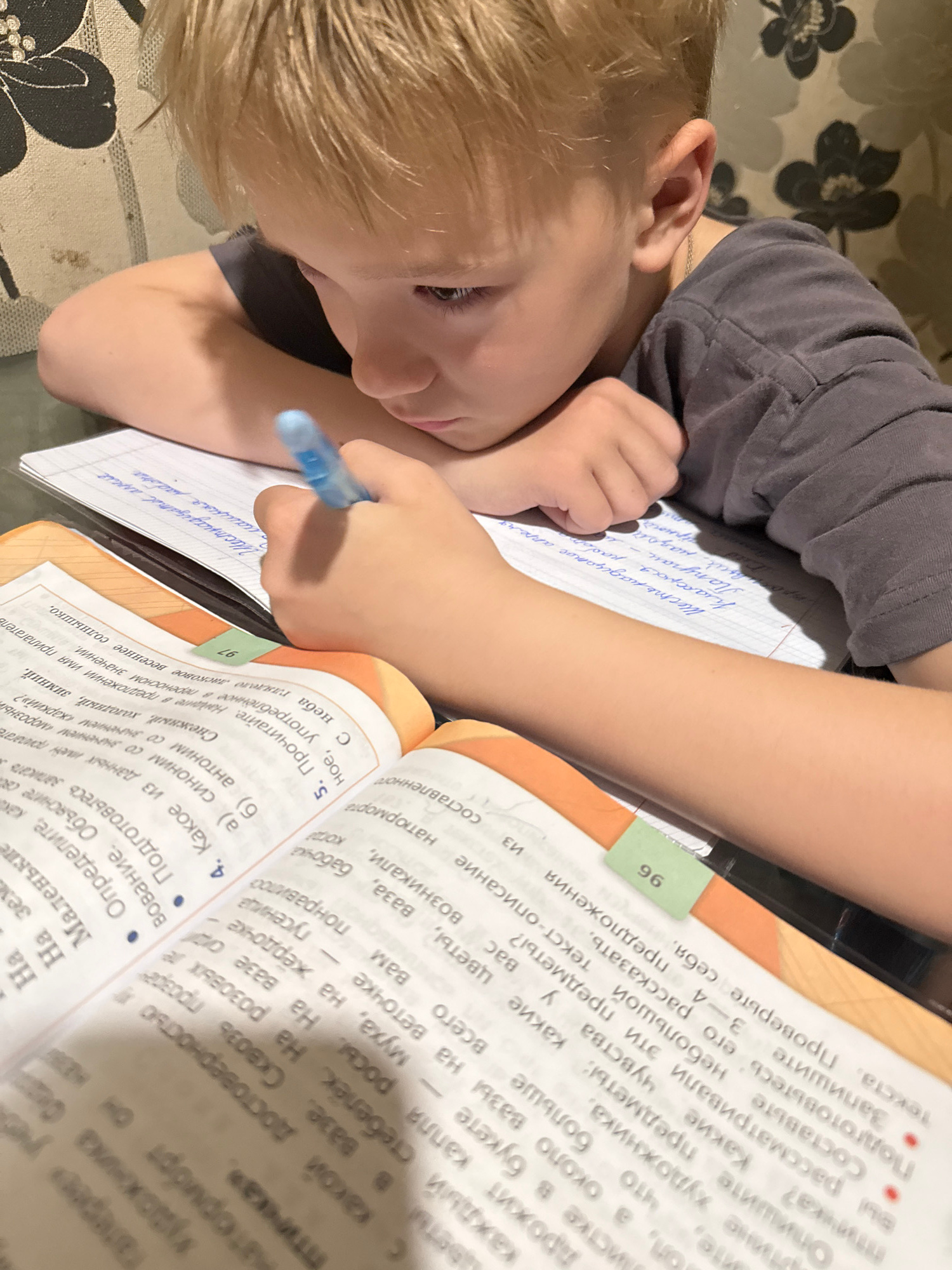 The image captures a young blonde-haired boy, likely a child, engaged in a study or homework session indoors, specifically in Dmitrov, Russia. He is lying down, resting his head on his left arm while…read more