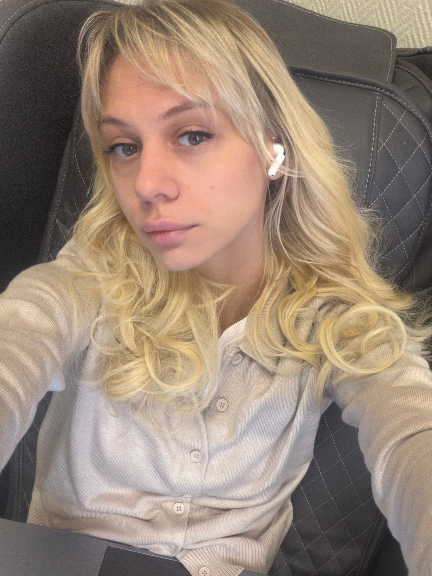 A young woman with blond wavy hair lies back in a dark grey leather chair. She is wearing a light tan button-down sweater. A white earbud is visible in her left ear. Part of a dark gray laptop is visi…read more