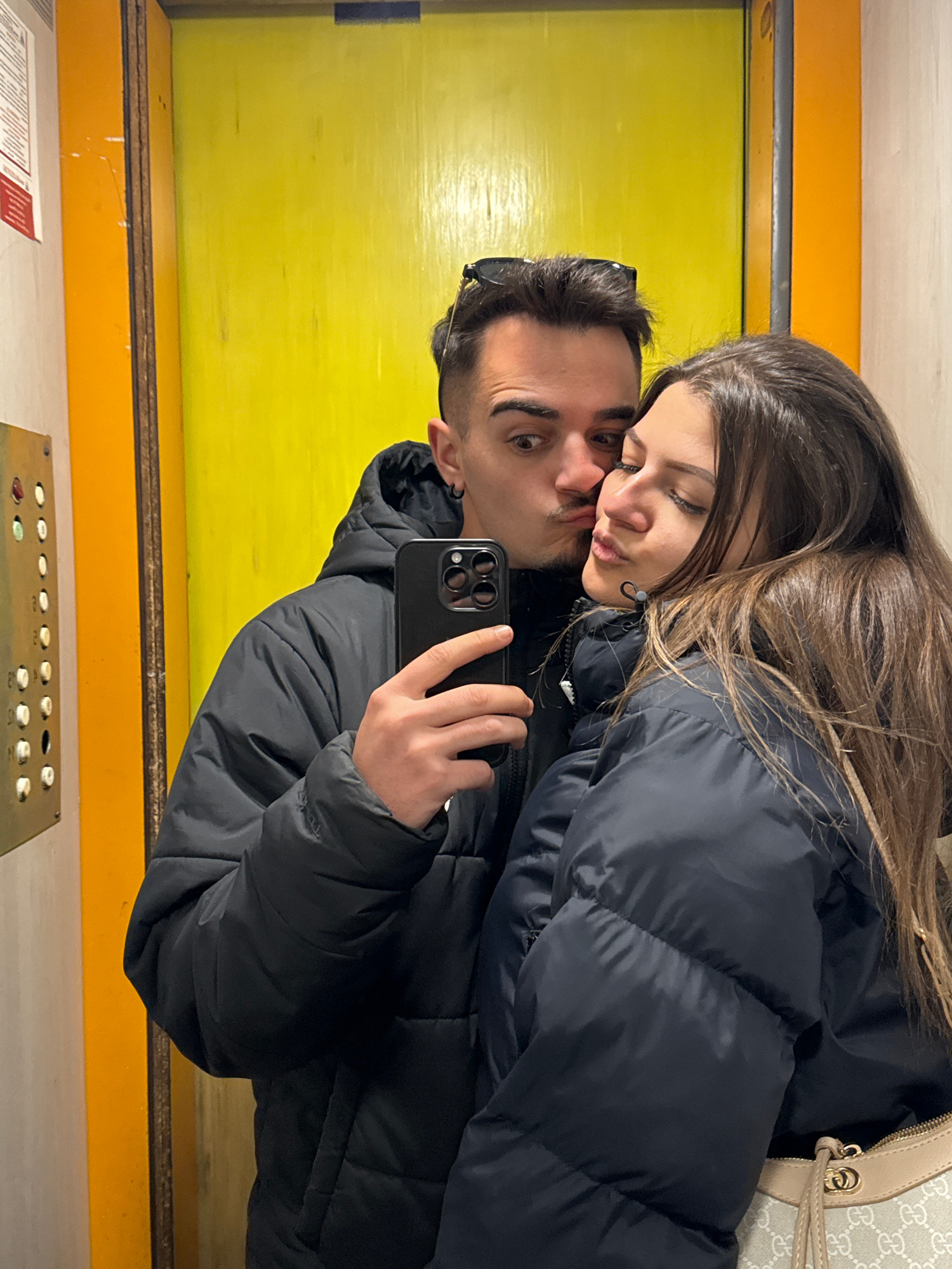 A young man and woman are taking a selfie in an elevator. The elevator has a yellow painted wall with an orange trim, and a vintage elevator button panel with green, red, and off-white buttons. The ma…read more