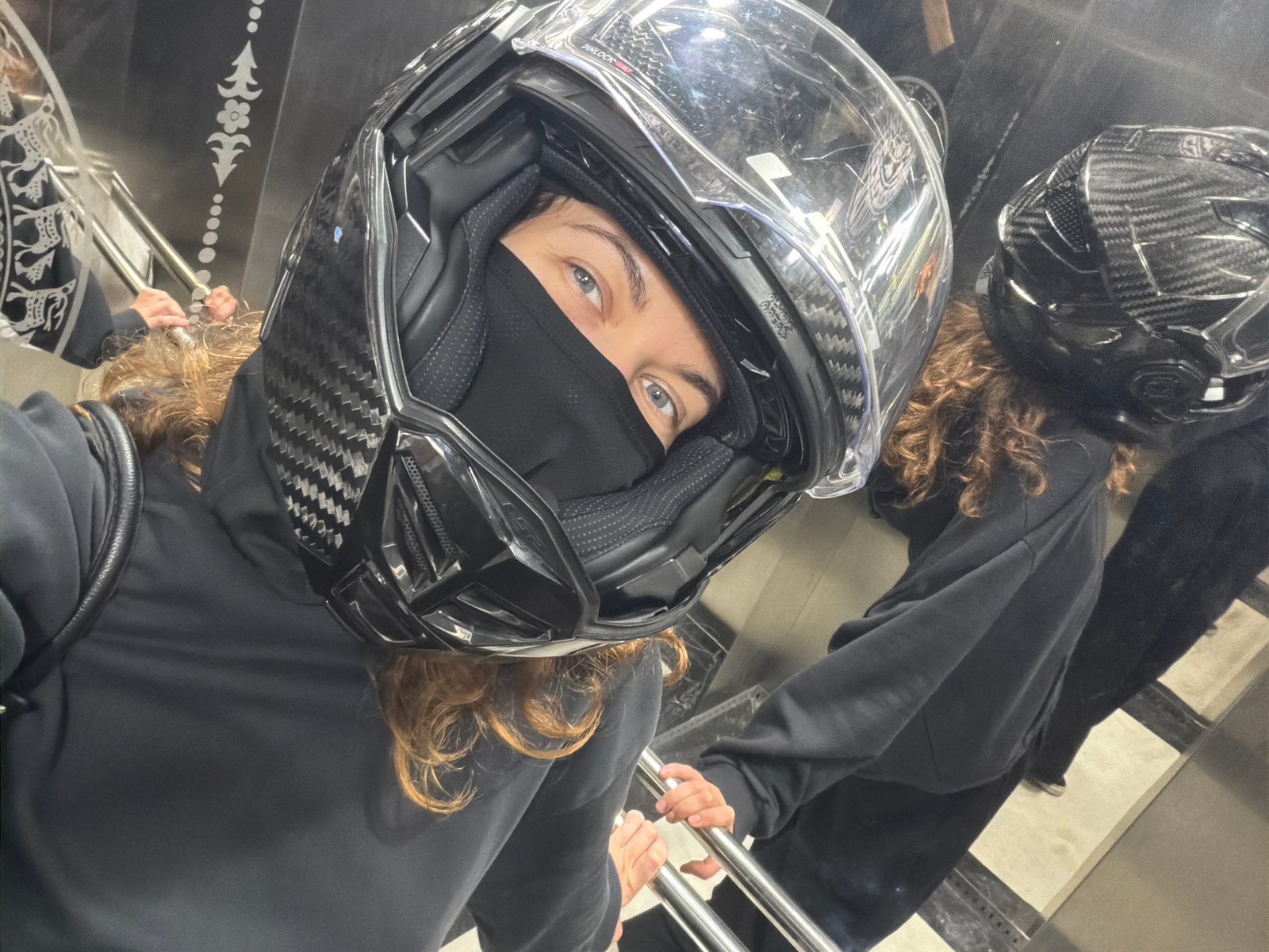 A selfie-style photograph shows a person wearing a black motorcycle helmet with a clear visor and a black face covering, obscuring the lower portion of their face, focusing primarily on their eyes. Th…read more