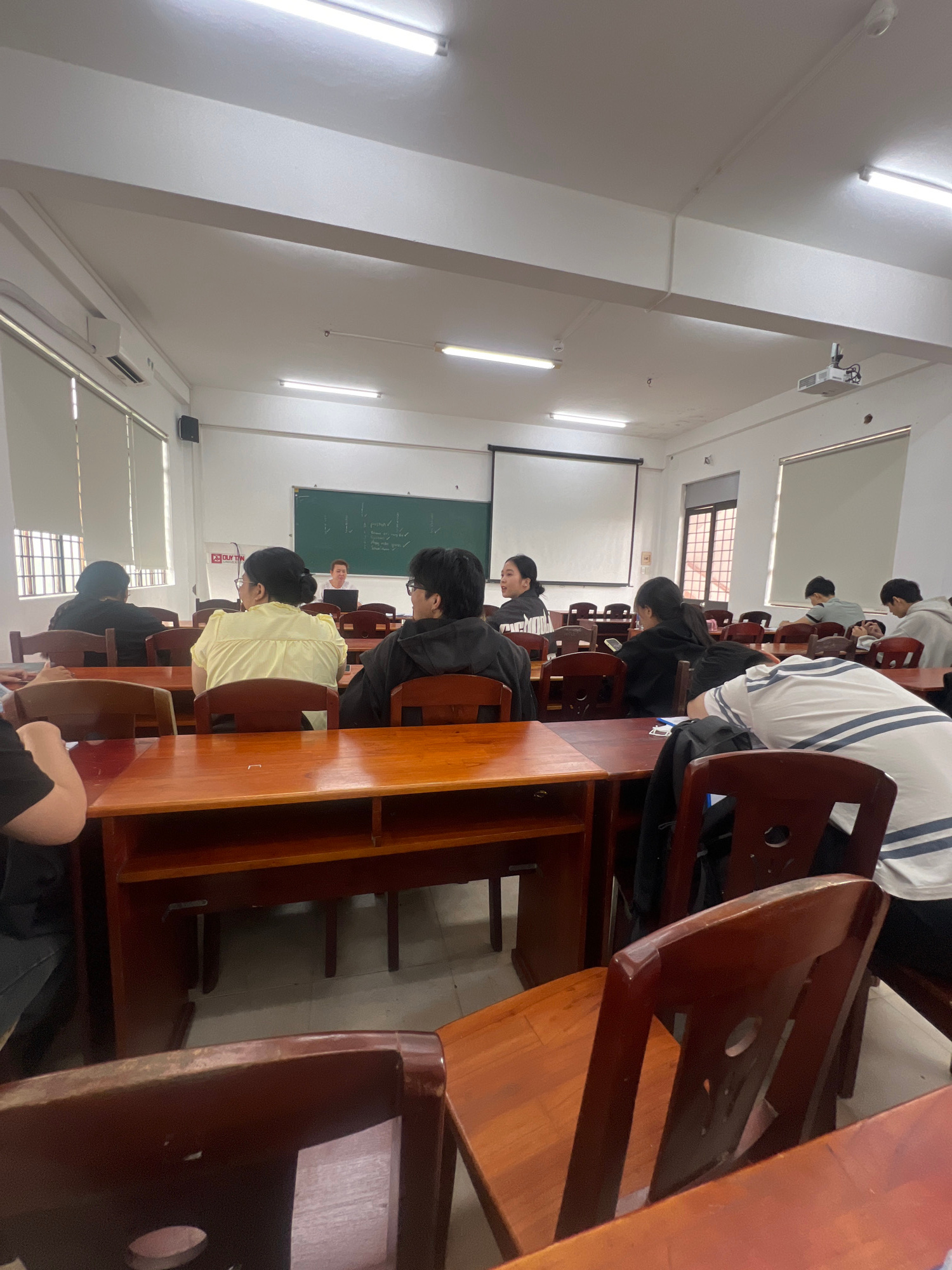 The image, rotated 90 degrees clockwise, captures a classroom scene in Đà Nẵng, Vietnam. The perspective is from the front-right of the room, looking towards the back and left side. **Subjects:** Num…read more