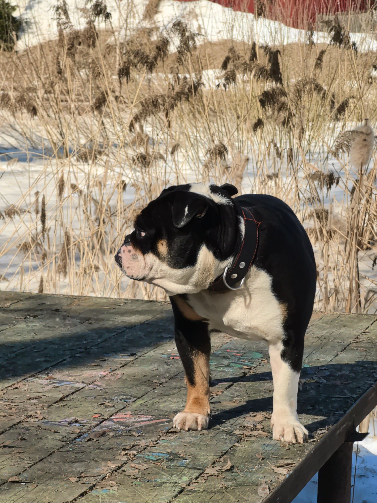 A bulldog stands on a weathered, wooden platform. The dog has a black and white coat, a collar with a ring, and its front left leg is mostly tan. In the background is a field of tall, dry grass with s…read more