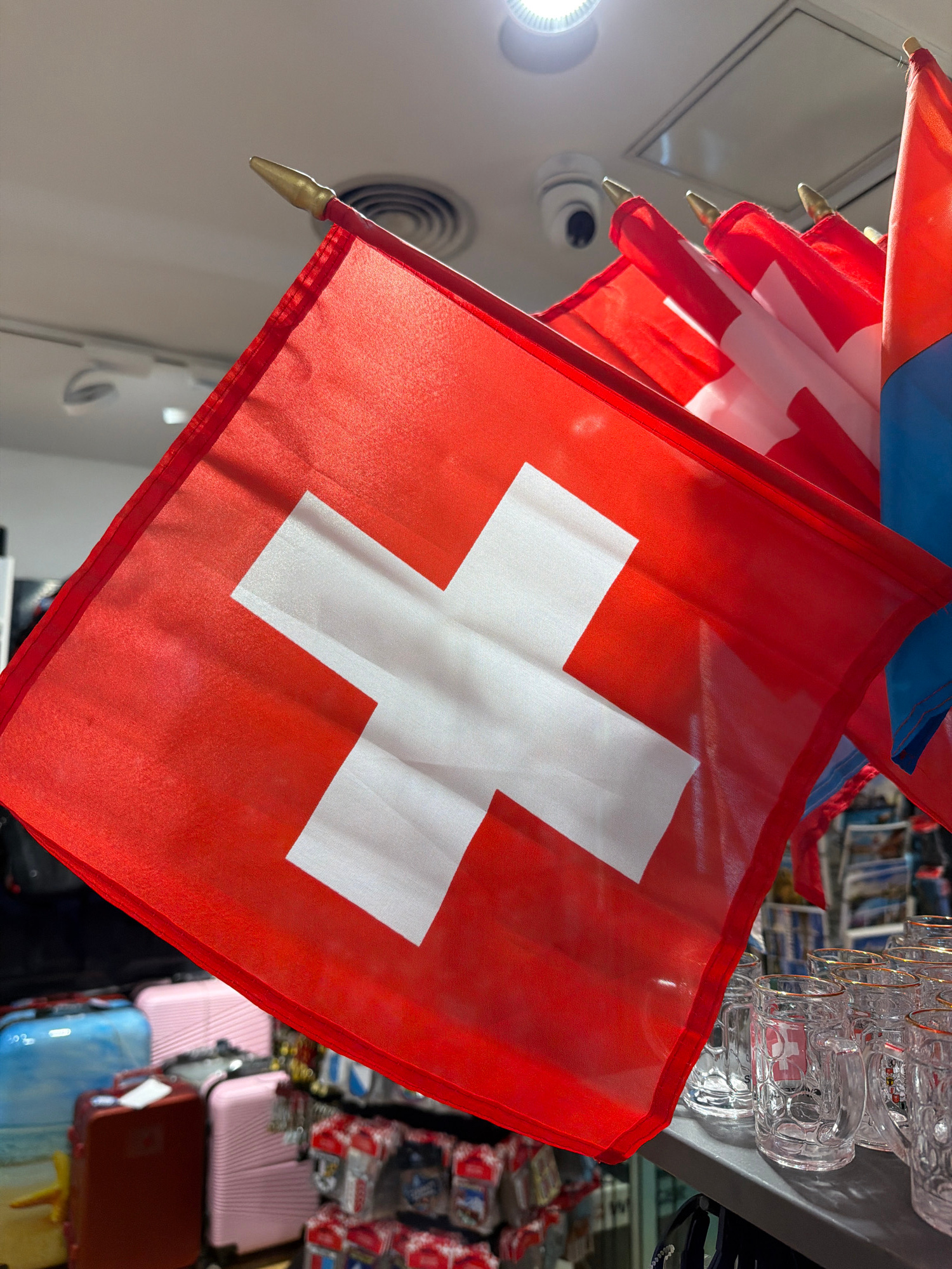 The image shows several Swiss flags hanging in a store in Zurich, Switzerland. The flags are red with a white cross in the center. Some clear glass mugs are in the background, along with other souveni…read more