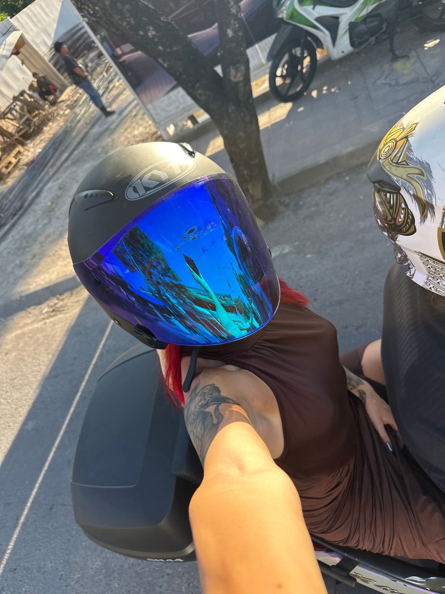 A close-up, angled shot depicts two people on a motorbike in North Kuta, Indonesia. The person on the back wears a brown dress and a black helmet with a blue mirrored visor. The other person has a whi…read more