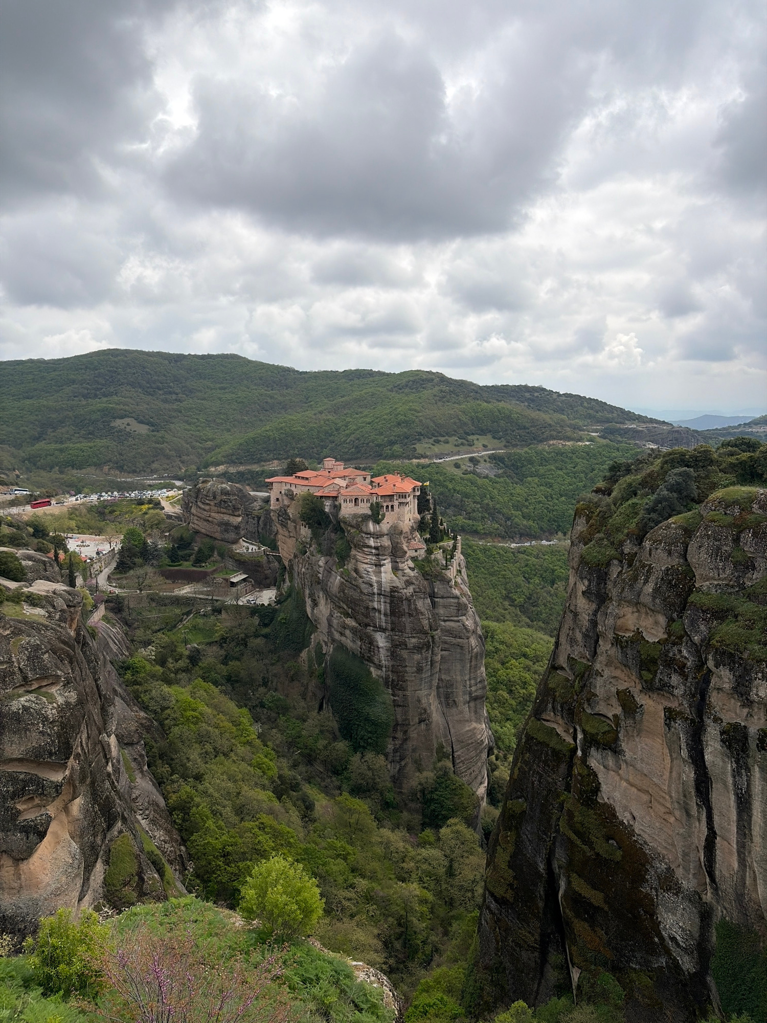 The image depicts a landscape view of a monastery perched atop a rock formation in the Meteora region near Kalabaka, Greece. The monastery has red-tiled roofs and a multi-tiered structure. The rock fo…read more