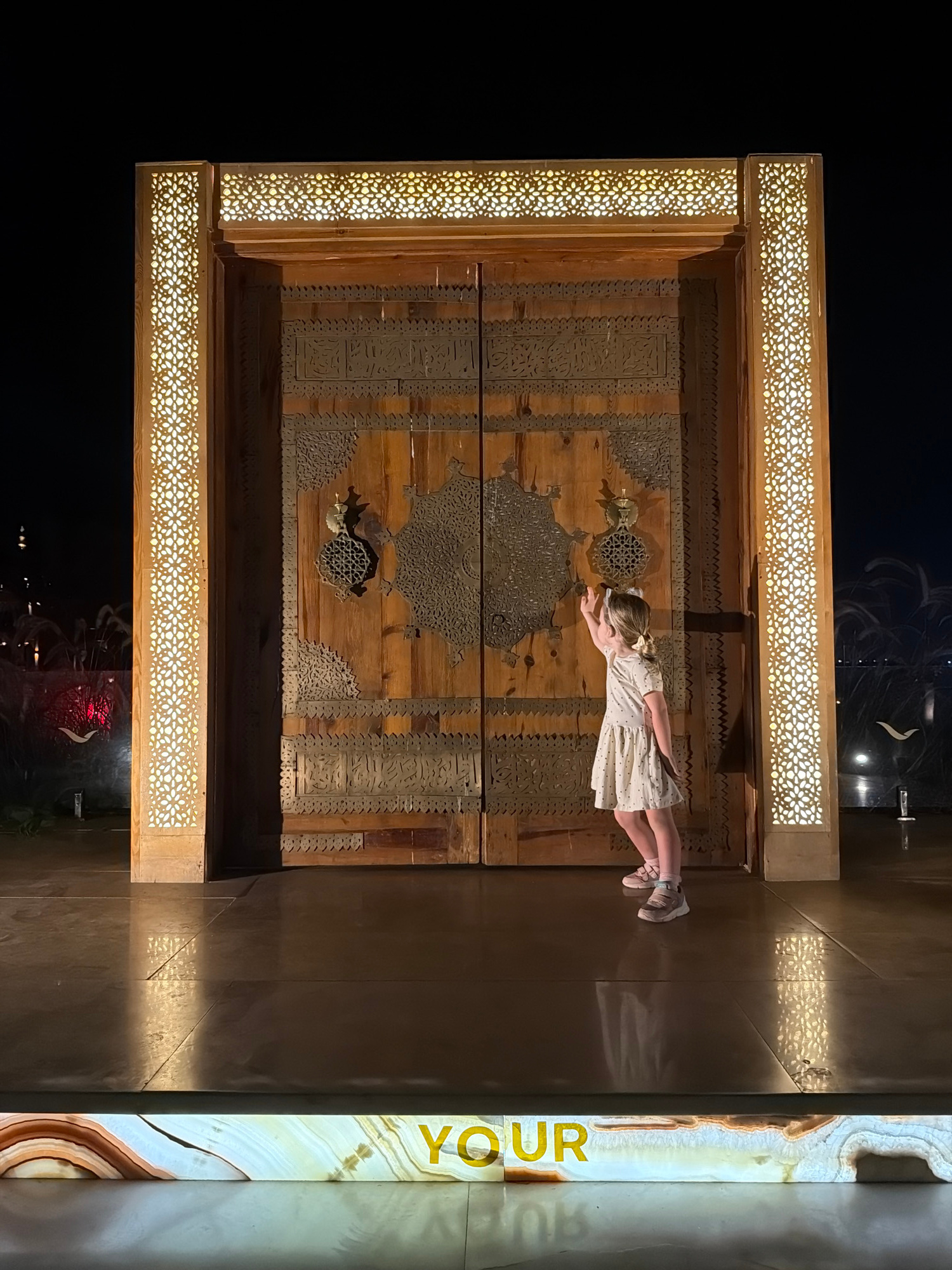 A young girl in a light-colored dress and shoes lies horizontally on a large, ornate wooden door, seemingly suspended in mid-air. The door is heavily decorated with metal patterns and borders, and it…read more