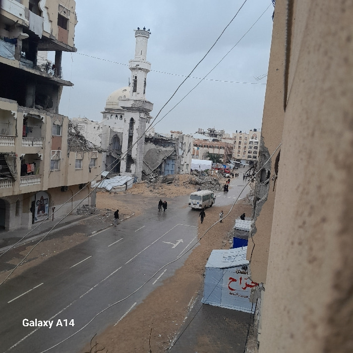 The image depicts a street scene in Khan Yunis, Palestinian Territory, under an overcast sky. The asphalt road is wet, indicating recent precipitation, with white lane markings and a directional arrow…read more