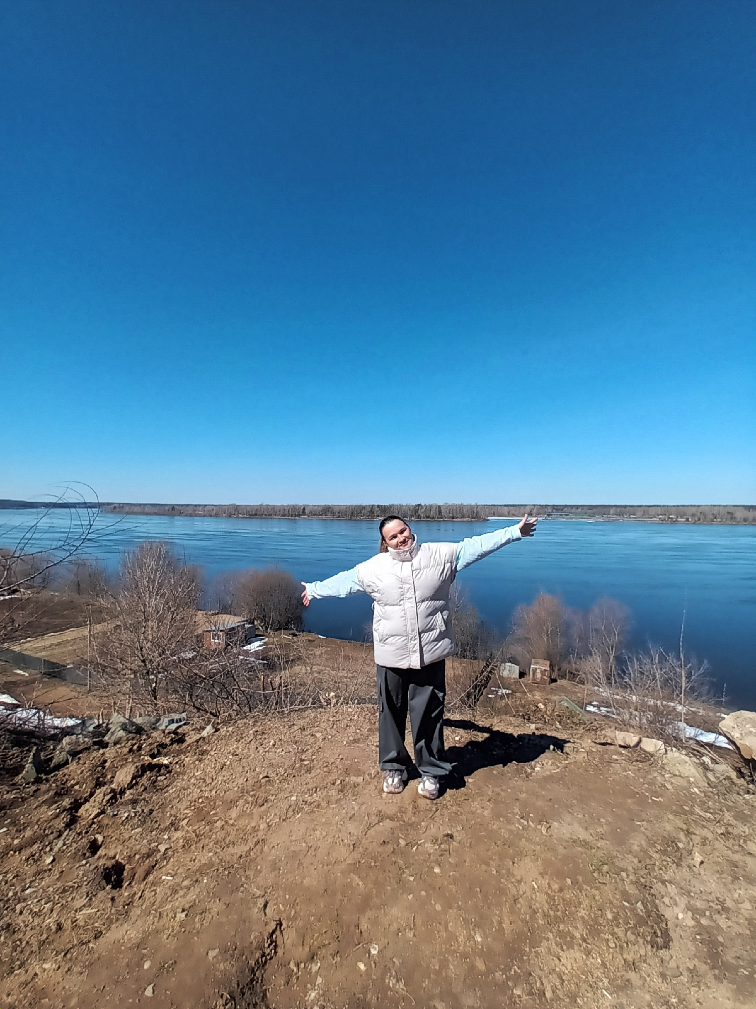 The image depicts a person standing on a dirt embankment near a body of water, possibly the Volga River, in the city of Olkhovka, Russia. The person is wearing dark pants and a light-colored vest. The…read more