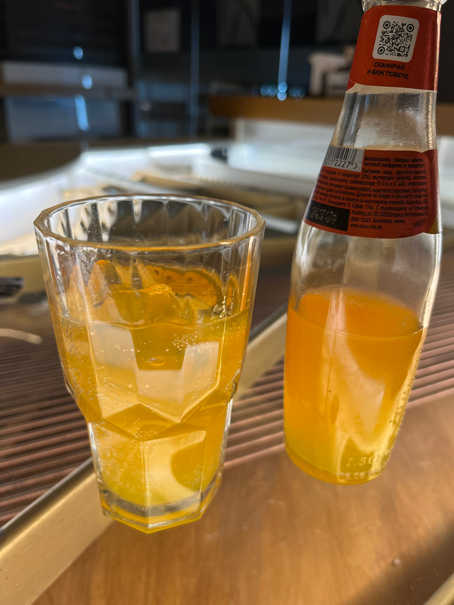 The image shows a bottle of Schweppes Mandarin soda lying on its side, next to a glass of the same beverage, also lying on its side. The bottle has a red label with Bulgarian text and a QR code. The s…read more
