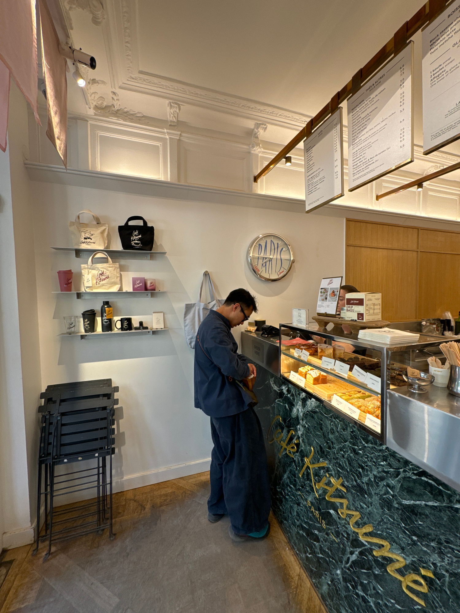 This image captures the interior of a stylish "Café Kitsuné" in Paris, France, likely during the daytime. The scene is centered around a dark green marble counter with "Café Kitsuné PARIS" elegantly w…read more