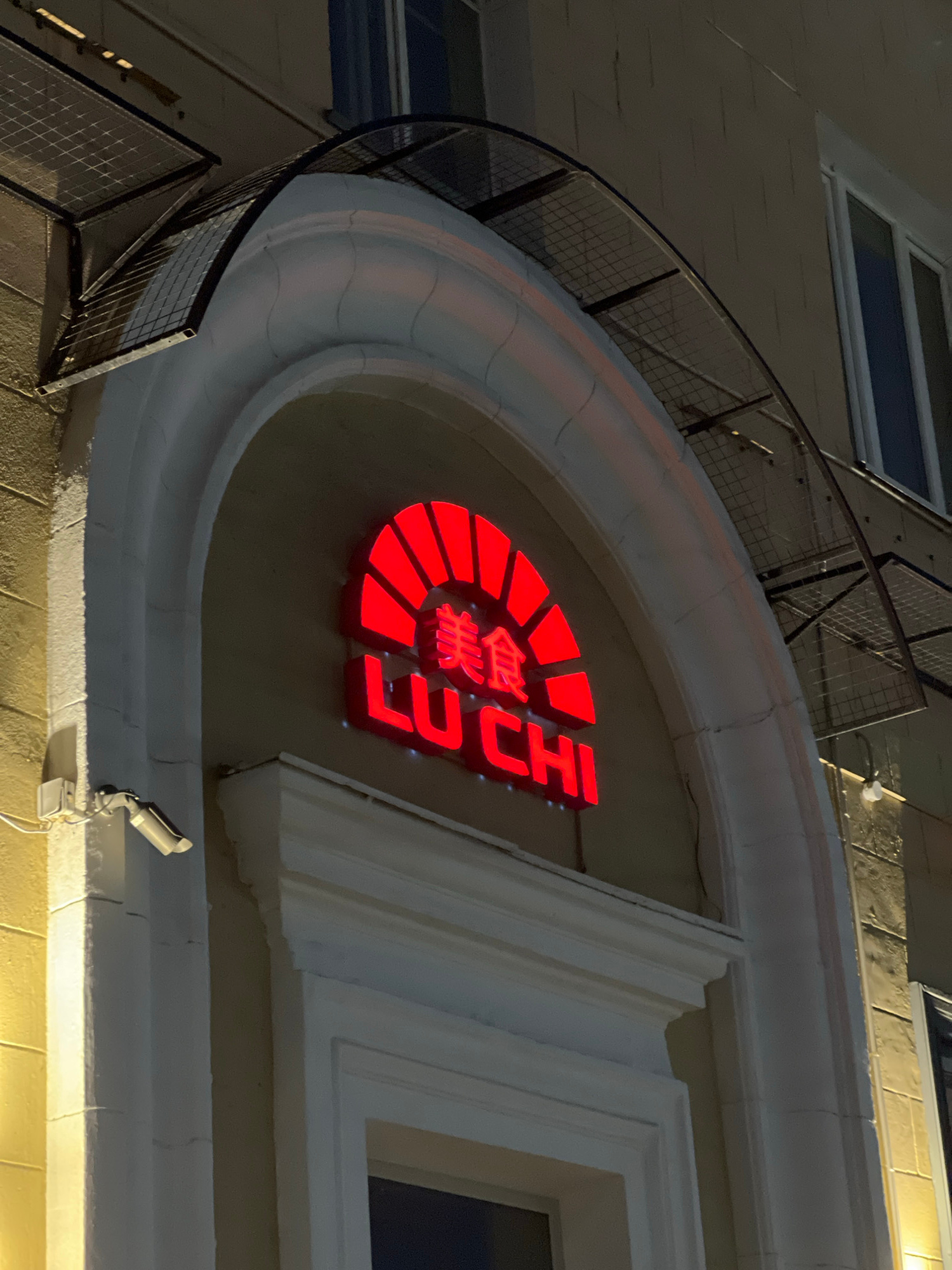 The image displays the exterior of a building at night, focusing on a prominent, red illuminated sign. The sign is mounted on a curved, light-colored architectural feature, likely a facade element or…read more