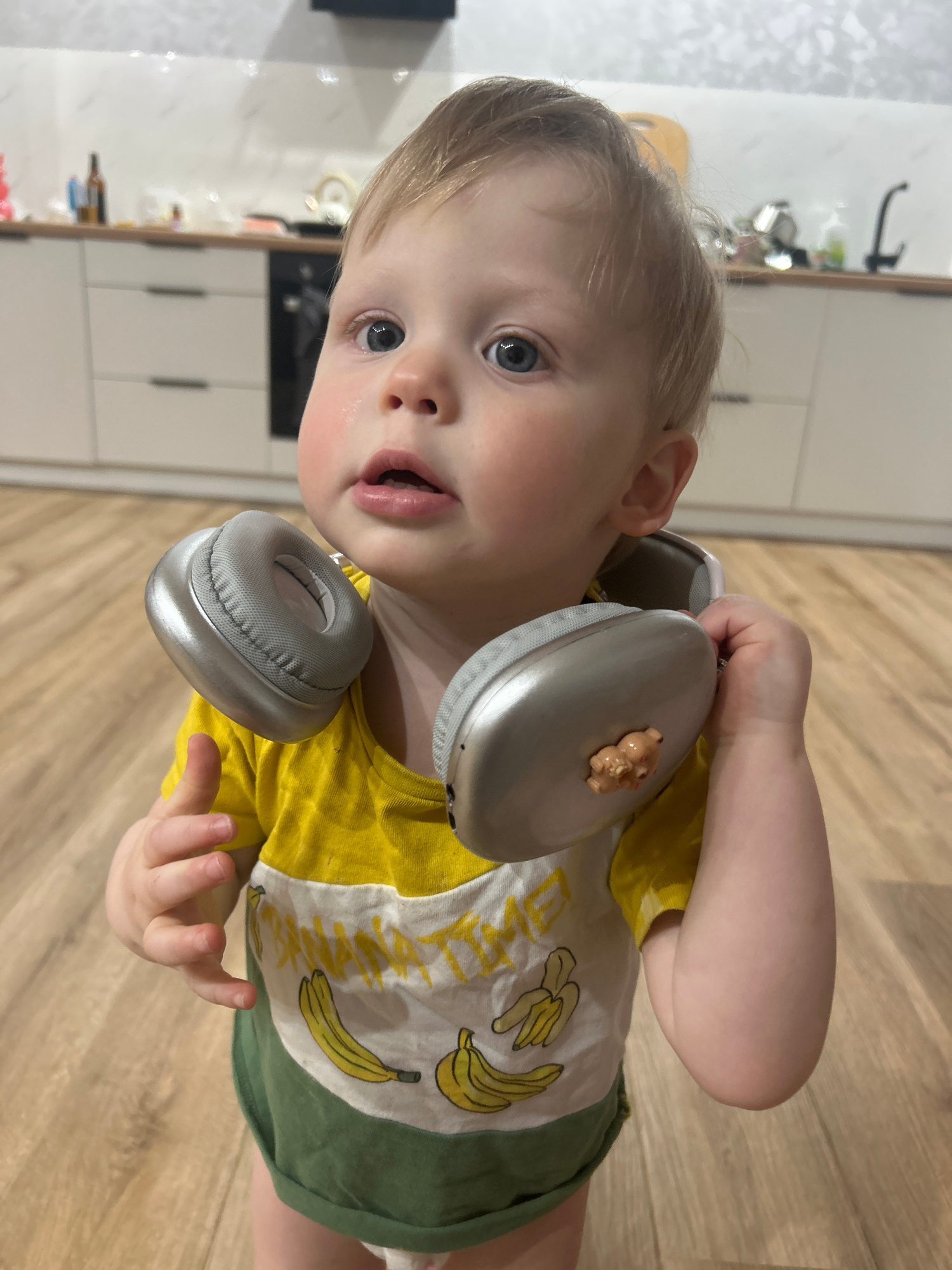 A young child, likely a toddler, is depicted in a close-up, chest-up shot within an indoor setting. The child has light blonde hair and bright blue eyes, looking directly at the camera with a curious,…read more