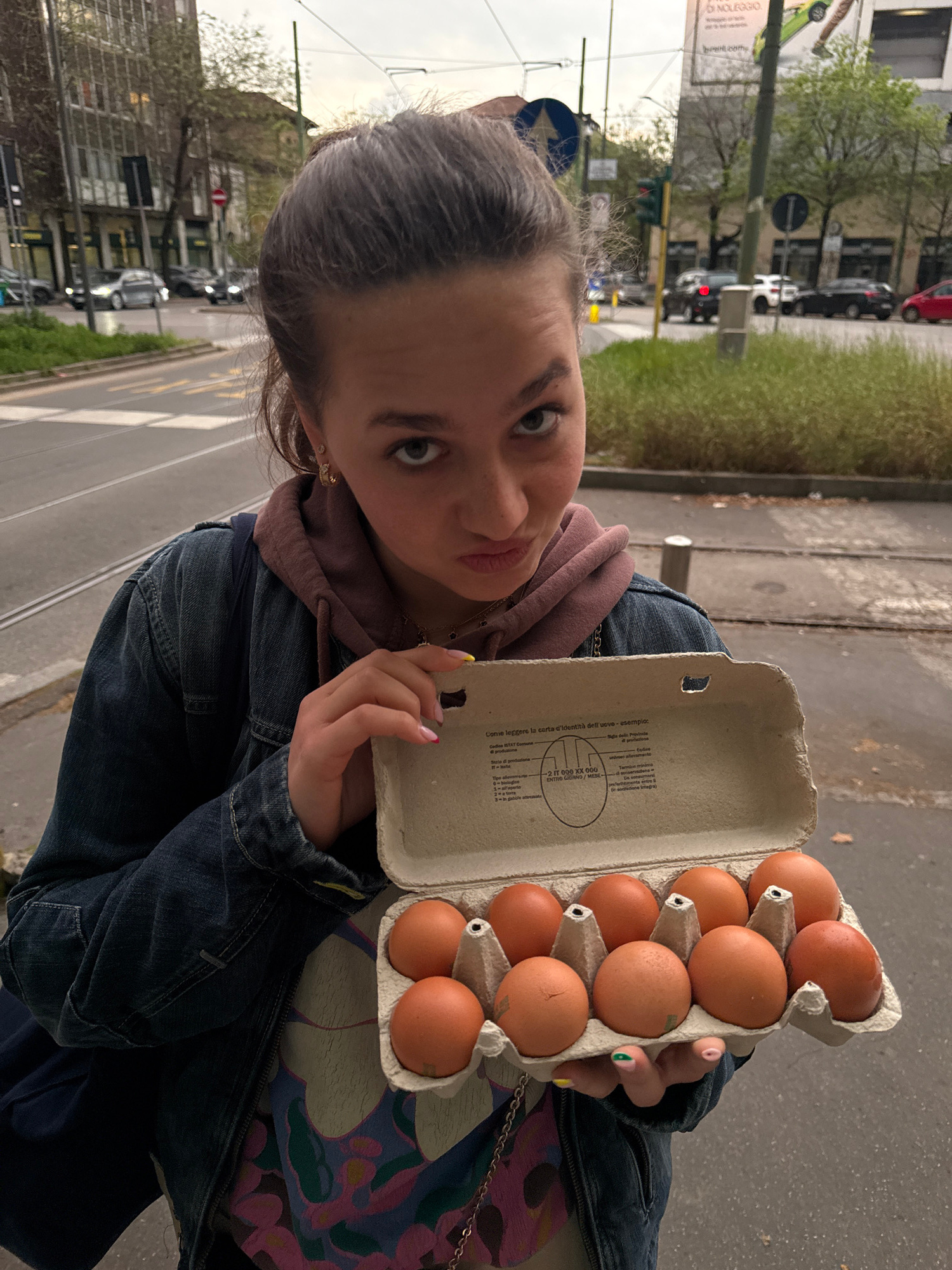 A medium-shot image depicts a young woman holding a carton of brown eggs. She is dressed in a blue denim jacket over a mauve hooded sweatshirt and a patterned top. The eggs are arranged in a typical c…read more