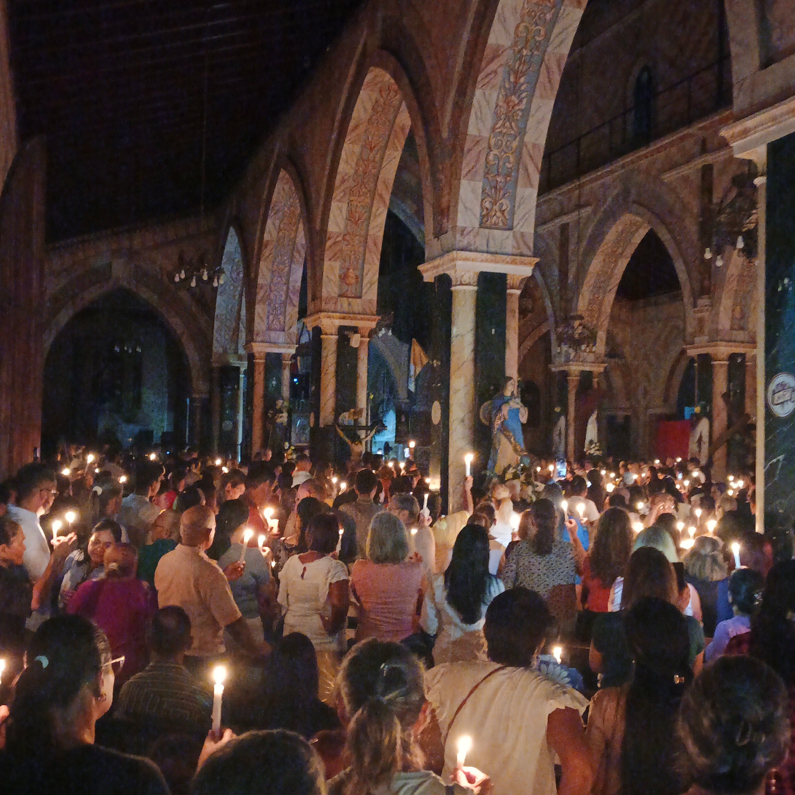 A dimly lit interior view of a church, crowded with people holding lighted candles. The architectural style features arches decorated with floral patterns. The church contains statues and columns. Peo…read more