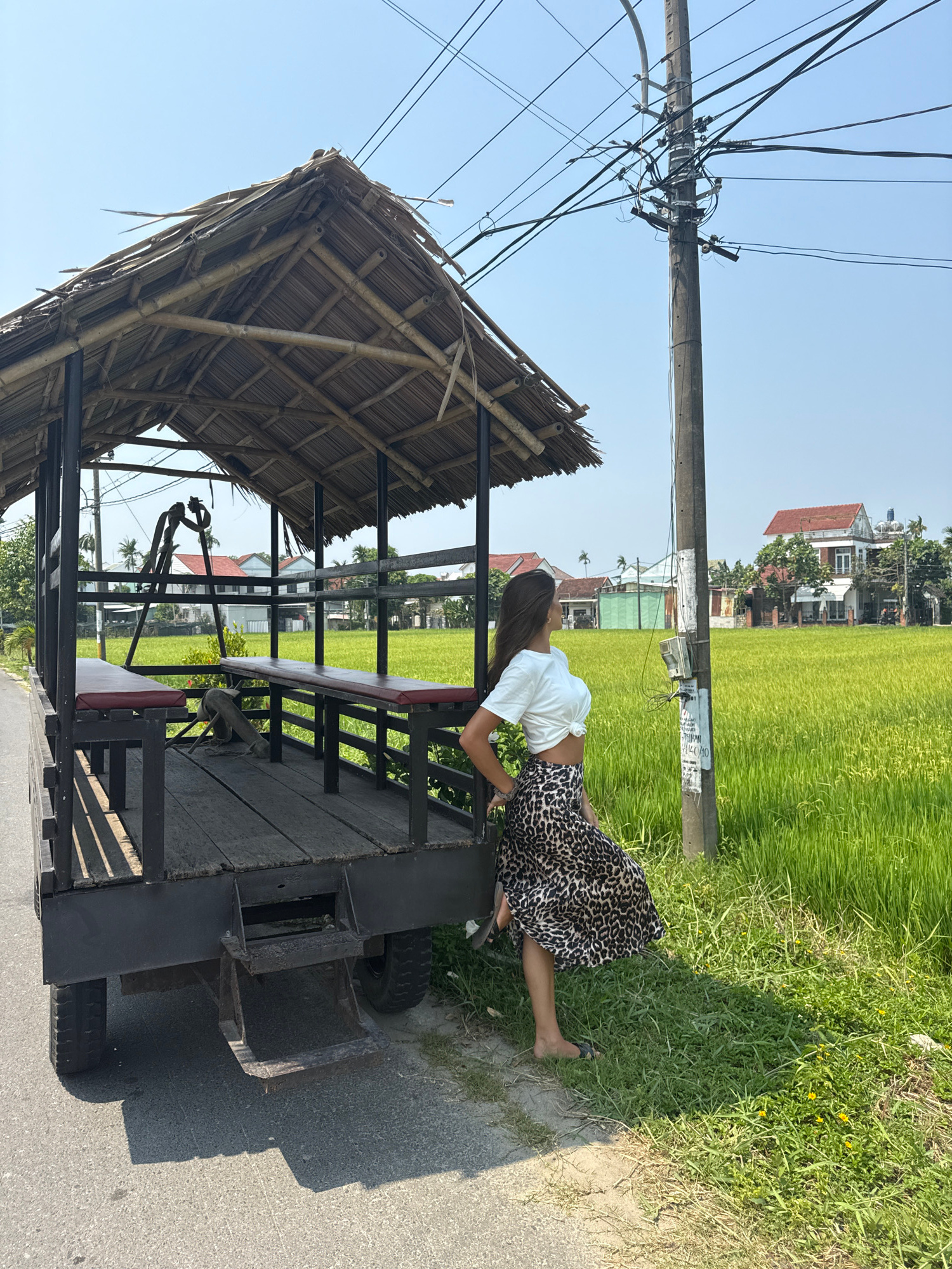 A young woman in a white tied top and leopard-print skirt leans against a black flatbed trailer with a bamboo roof, on the side of a road. The flatbed has benches inside. A telephone pole with wires s…read more