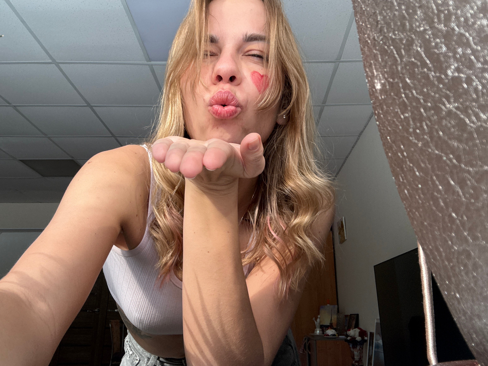 A woman with blonde hair is holding her hand up to the camera. She is upside down in the image. She has a red heart drawn on her face. She is wearing a white tank top. The ceiling in the background is…read more