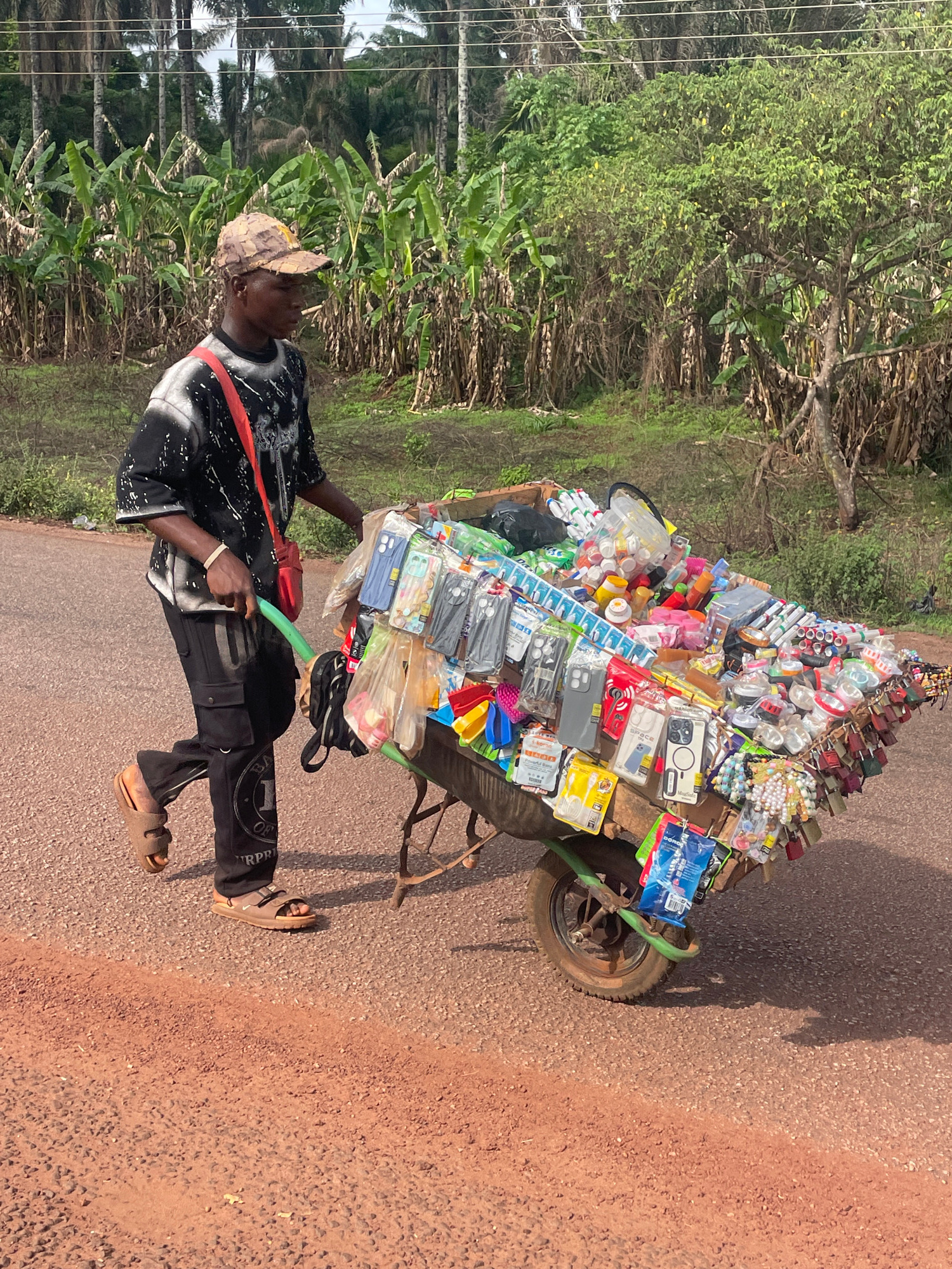 A man walks along a paved road in Ogbe, Nigeria, pulling a heavily laden, single-wheeled cart. The cart is filled with a variety of goods, including phone cases, locks, and plastic containers. The man…read more
