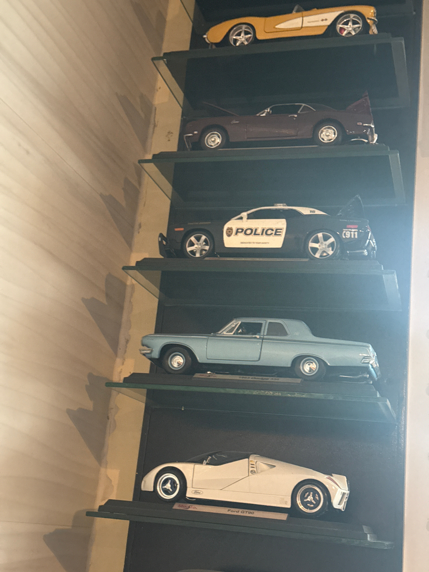 The image shows a collection of five die-cast model cars displayed in individual compartments within a dark enclosure. The cars are arranged in a row. From left to right, the models appear to be a gol…read more