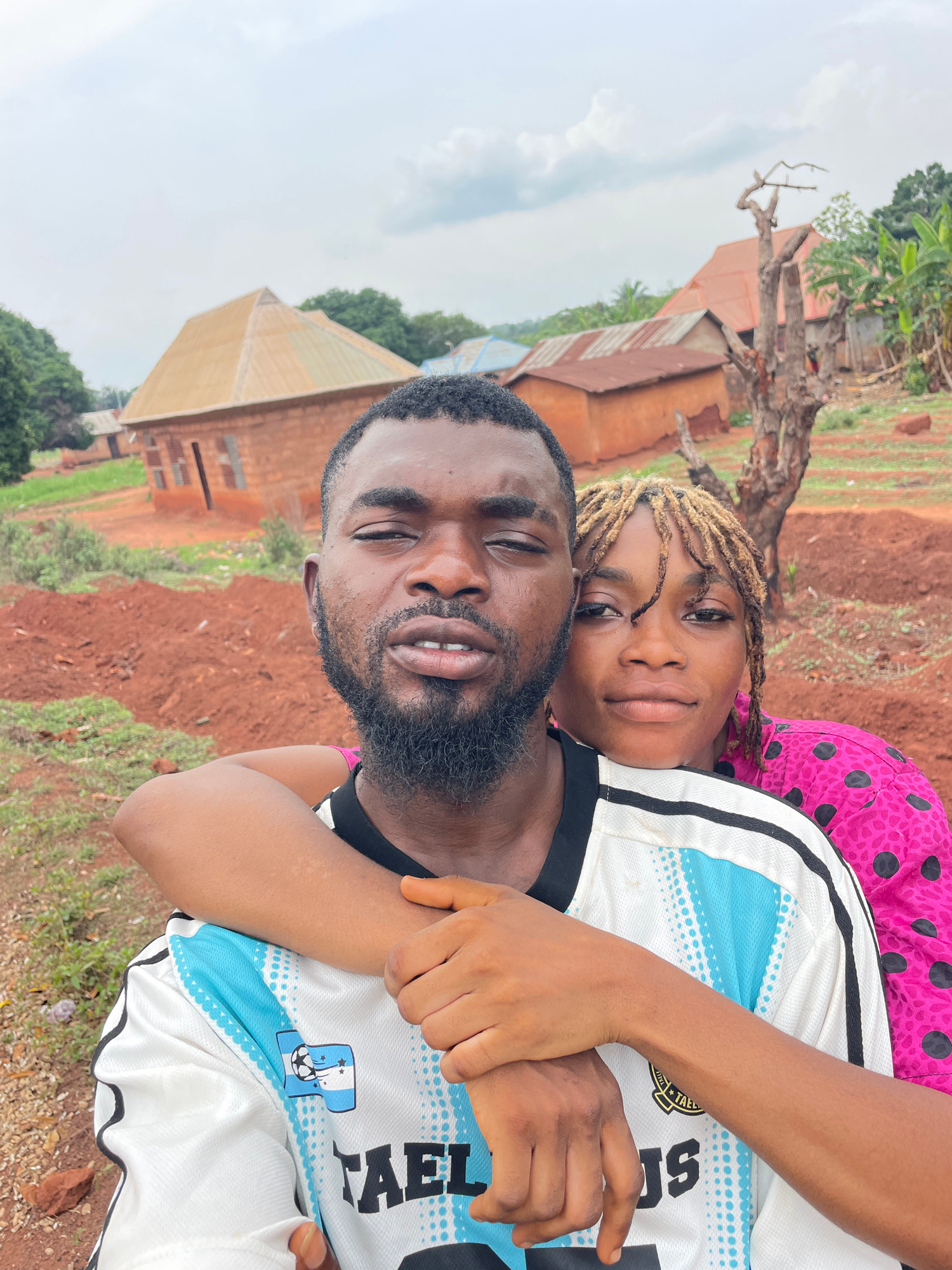 A photograph taken at Ogbe, Nigeria, shows a man and woman in an embrace. The man has dark skin, a full beard, and short dark hair. He is wearing a white and blue soccer jersey. The woman, slightly be…read more
