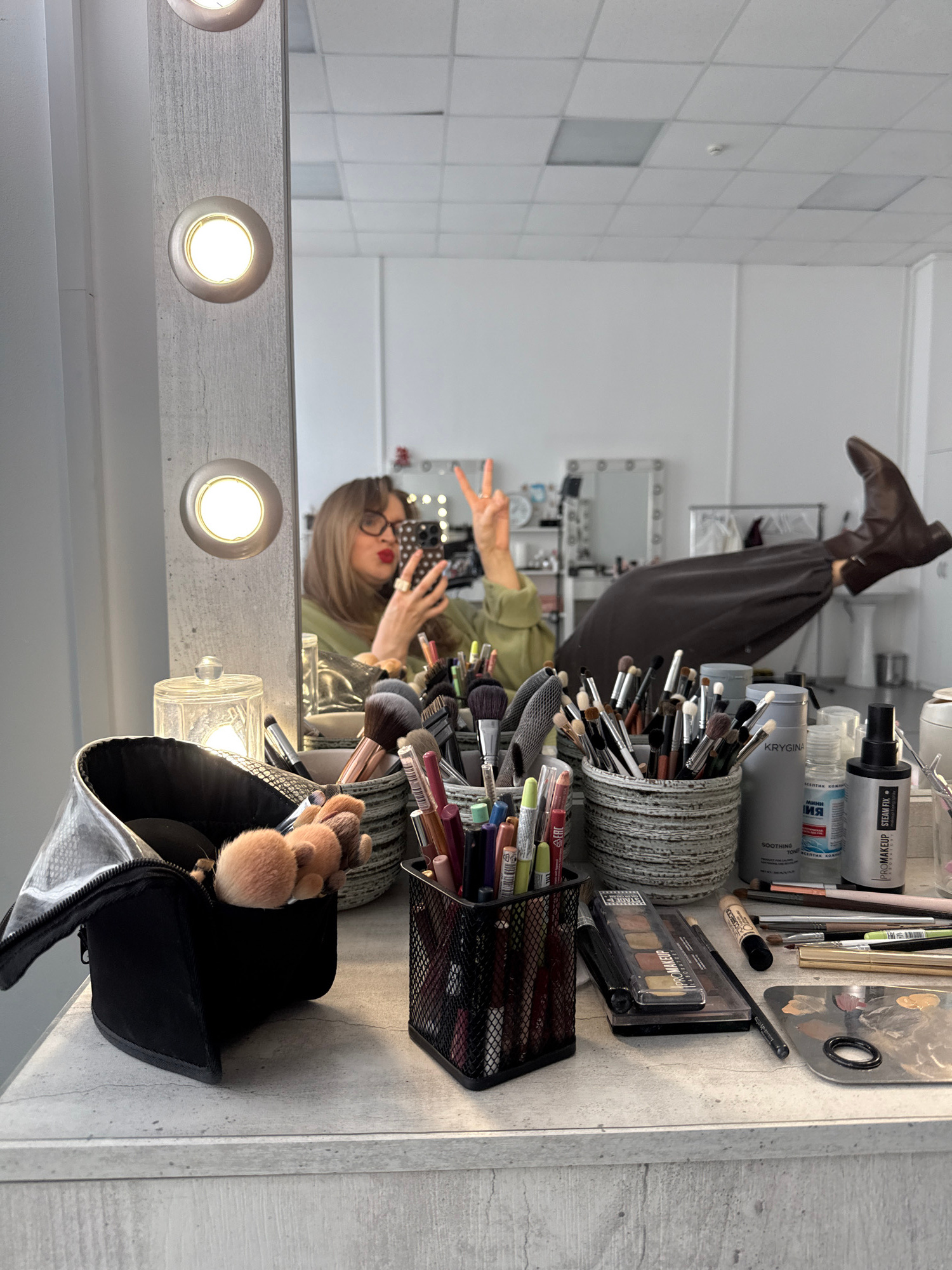 The image is a selfie taken in a mirror by a person with blonde hair and glasses. The person is wearing a green shirt and making a peace sign with their left hand. The reflection in the mirror shows a…read more