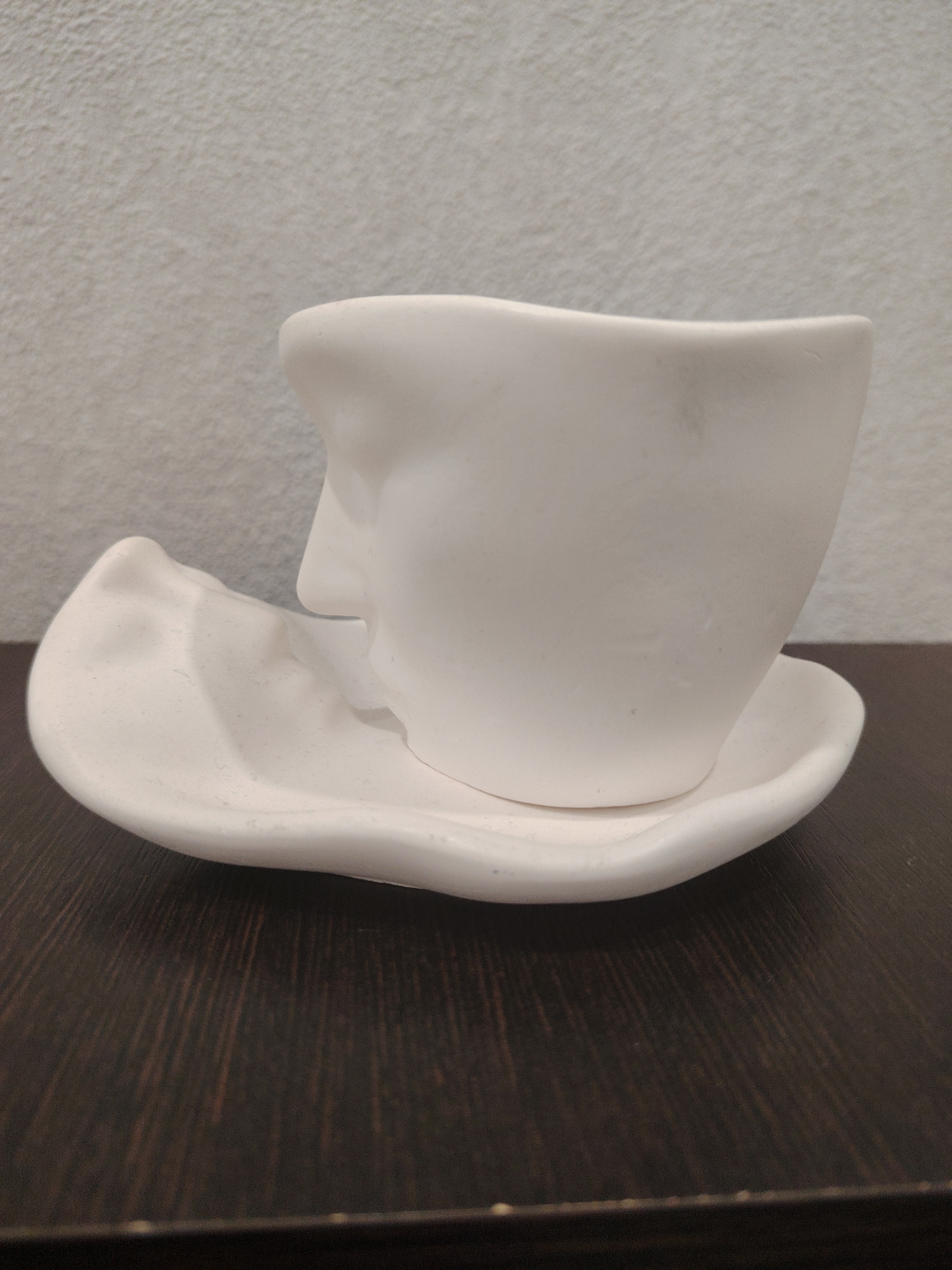 A white, ceramic cup and saucer with a distorted face design sits on a dark, wood-grain surface. The saucer is irregularly shaped, with a pronounced depression. The cup rests off-center on the saucer.…read more