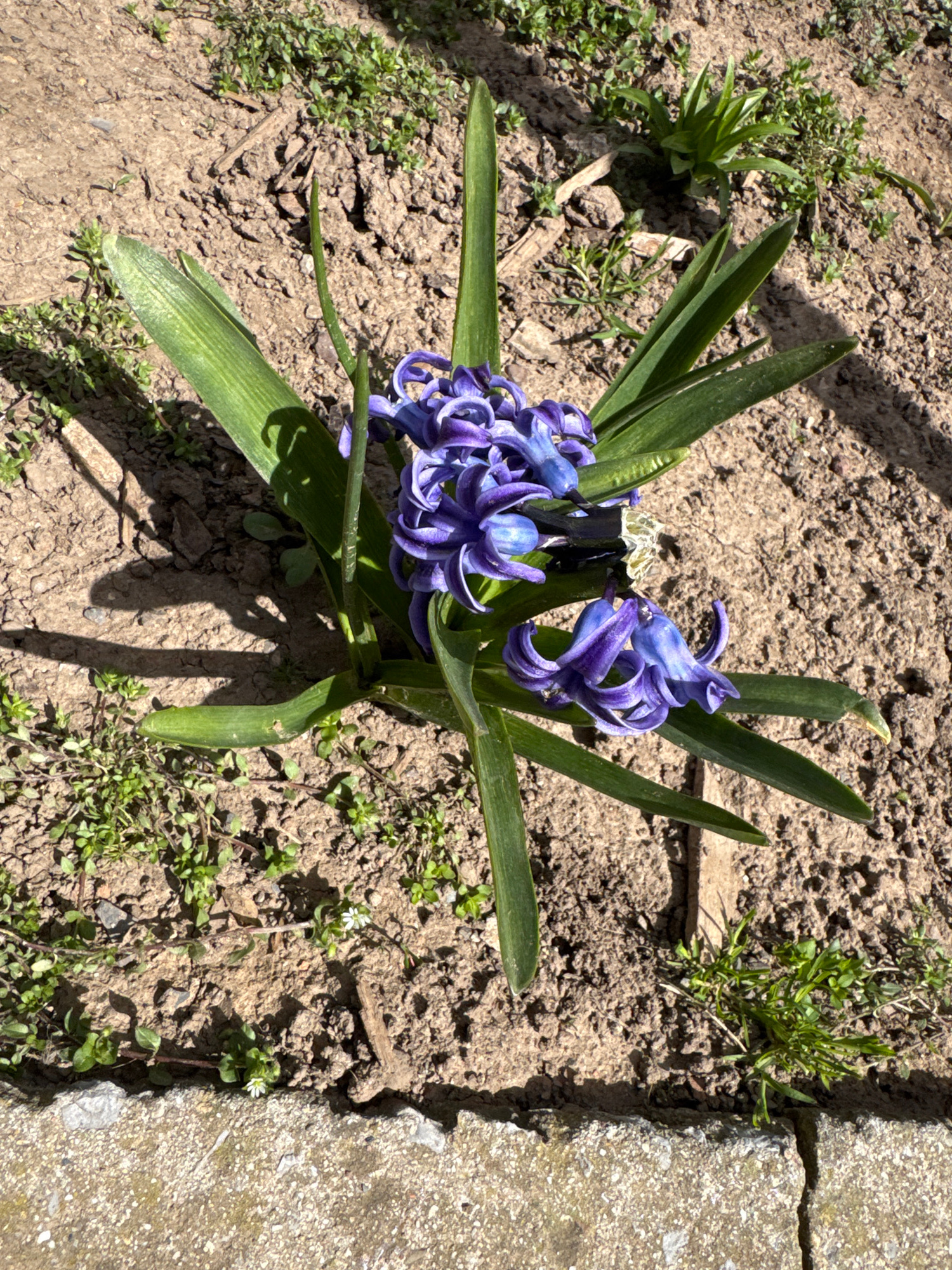 The image shows a purple hyacinth flower in a garden bed. The plant has several green leaves and a cluster of purple flowers in bloom. The surrounding soil is dry and brown. Some small weeds and grass…read more