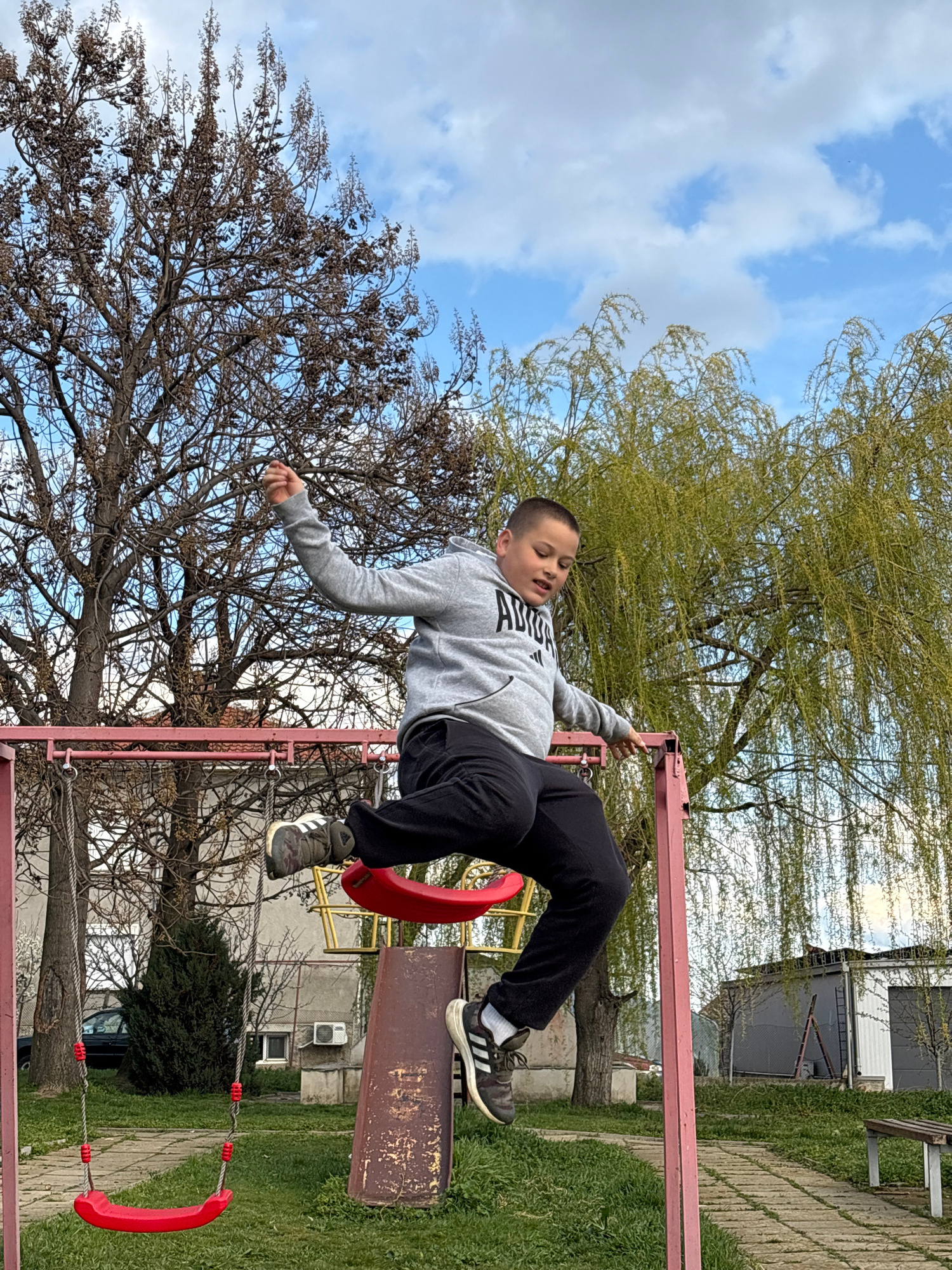 A young boy is upside down on a playground swing in an unknown city. He is wearing a gray hoodie and black pants. His Adidas sneakers are visible. He is holding onto the swing set frame. The environme…read more