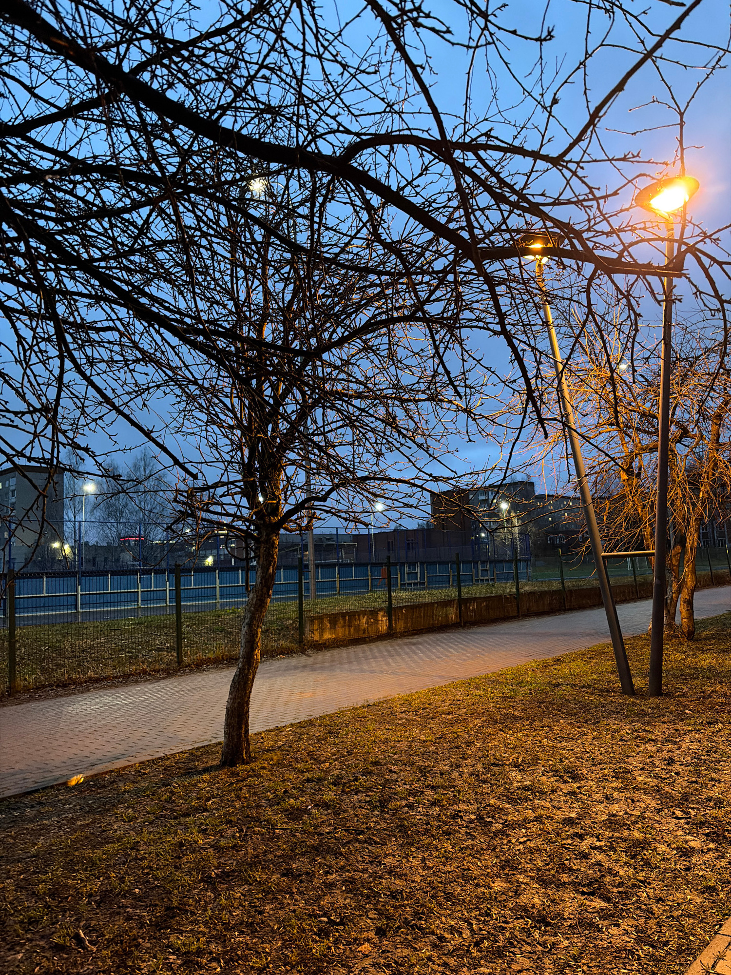 The image depicts an outdoor scene at dusk in Izhevsk, Russia. A bare tree with many branches fills the left side of the frame, obscuring the blue sky in the background. A streetlight with a warm glow…read more